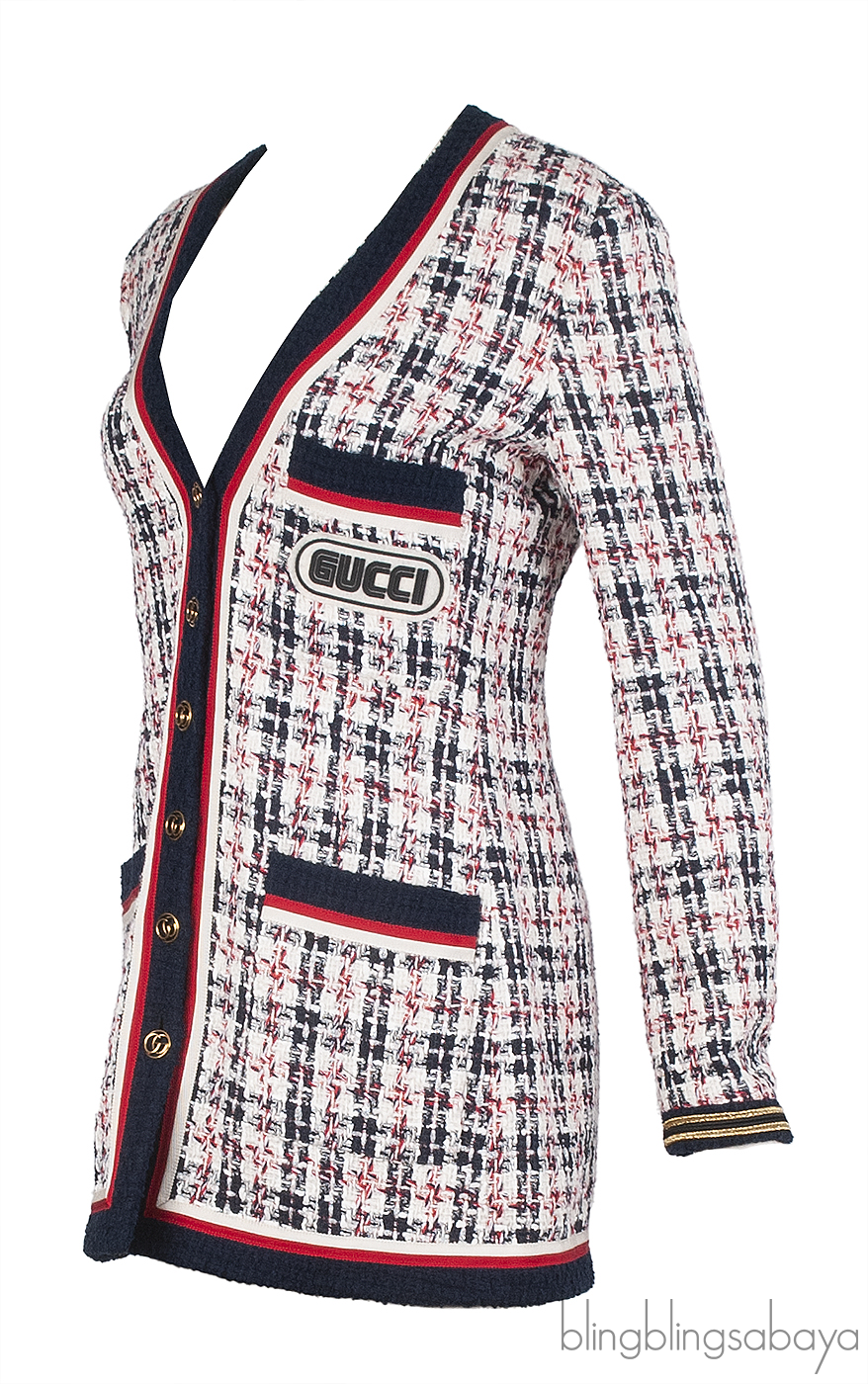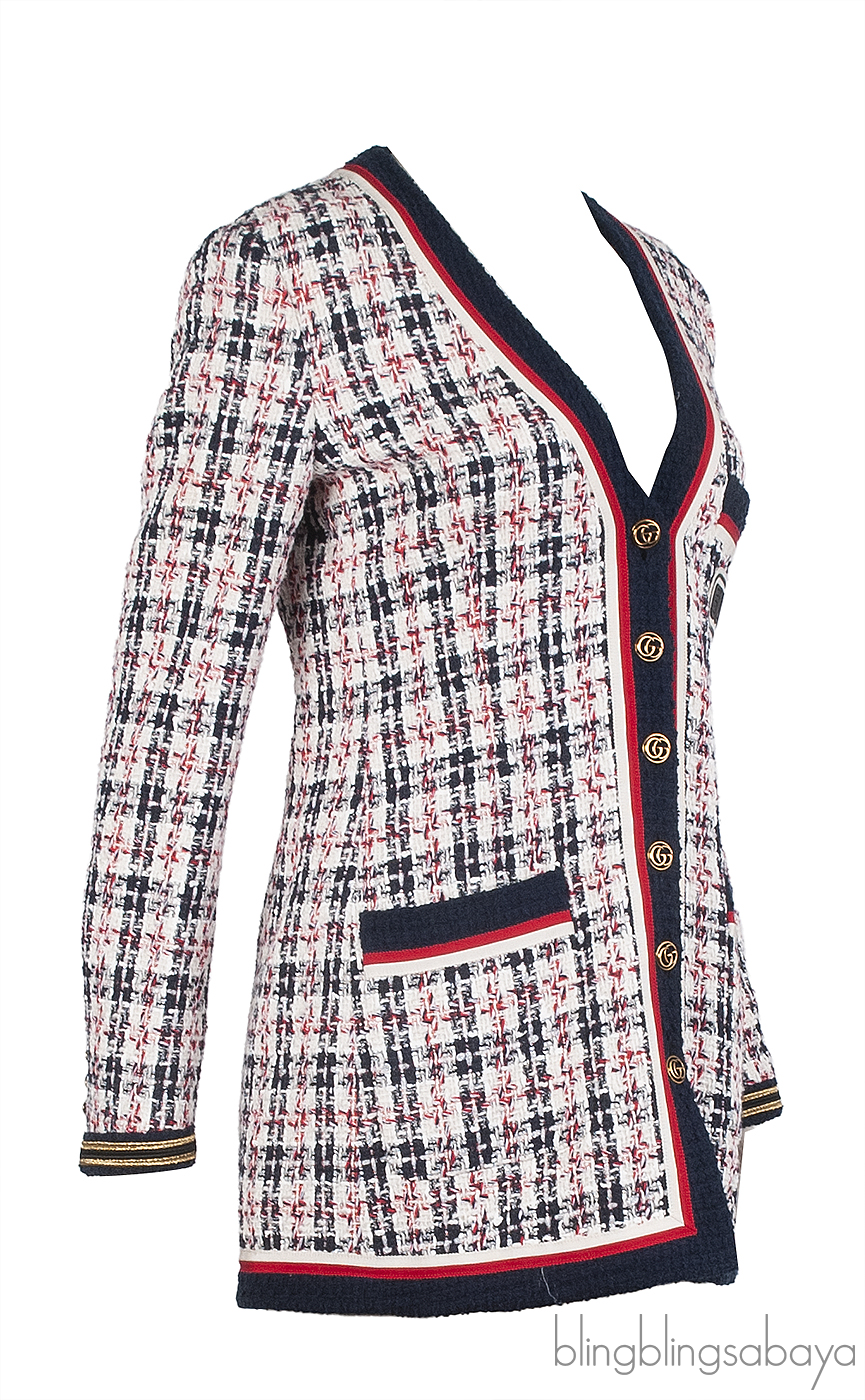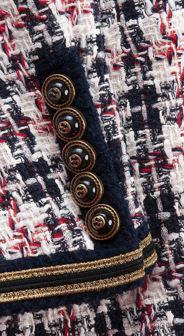 This Gucci tweed blazer is crafted from multicolored tweed cotton blend fabric with floral printed off-white fabric lining. This jacket features a V-neckline, front GG gold button closure, and long sleeves with buttoned cuffs. It includes welt pockets , Gucci Web stripe trim, along with a GUCCI logo patch.