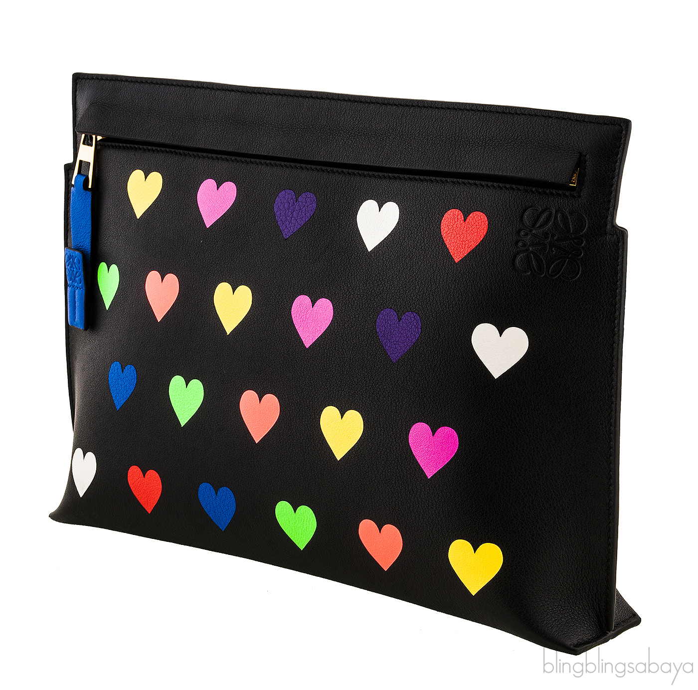 This Hearts T Pouch Clutch from Loewe is made of black leather accented with the golden hardware. This lovely clutch features a rainbow color heart design at front and finished with a front zip fastening, an embossed logo and gold-tone hardware. Interior is fully lined with black fabric and has several pockets for organization. This stunning clutch come with detachable & adjustable black strap and has another wide shoulder strap with multi-color heart print.