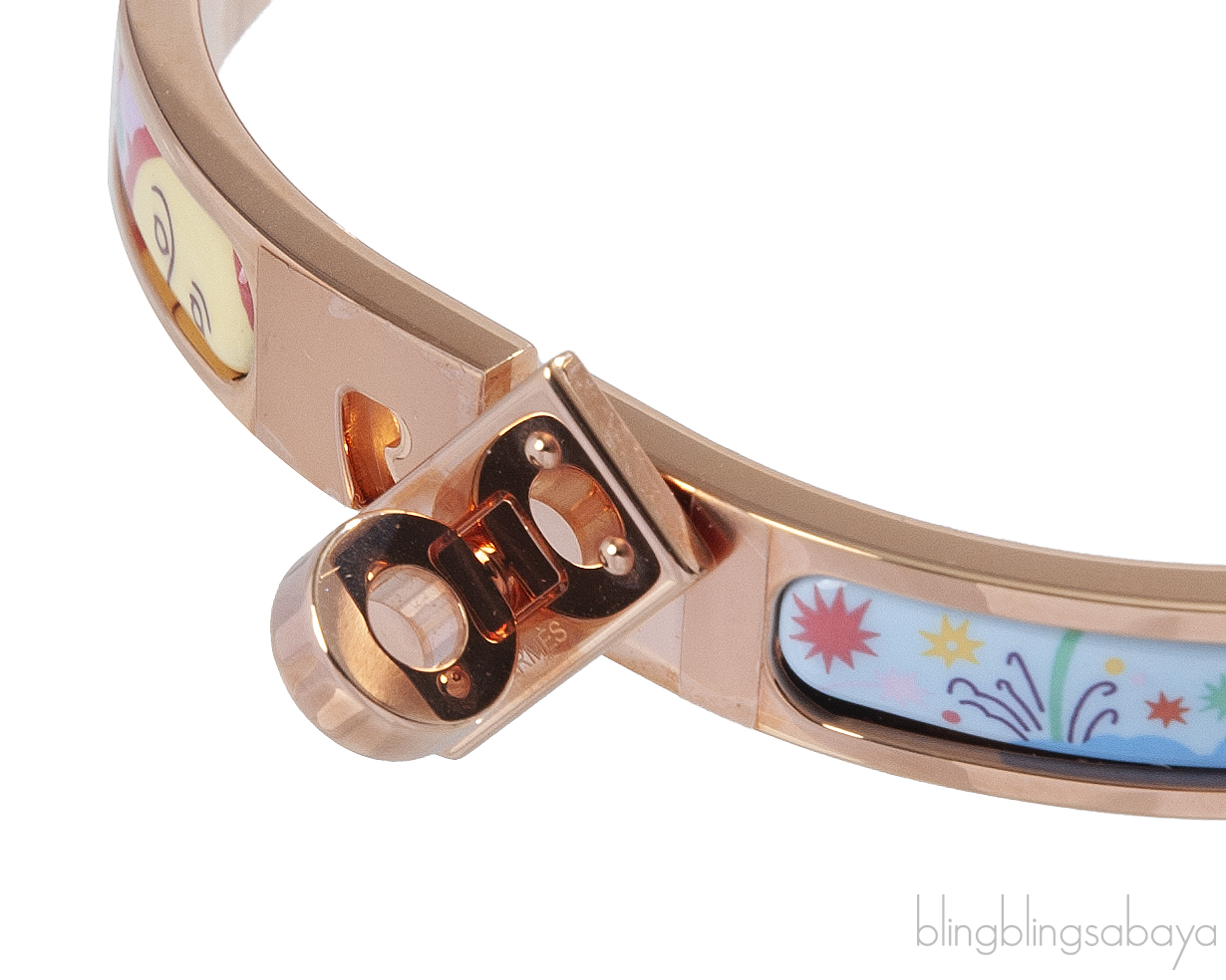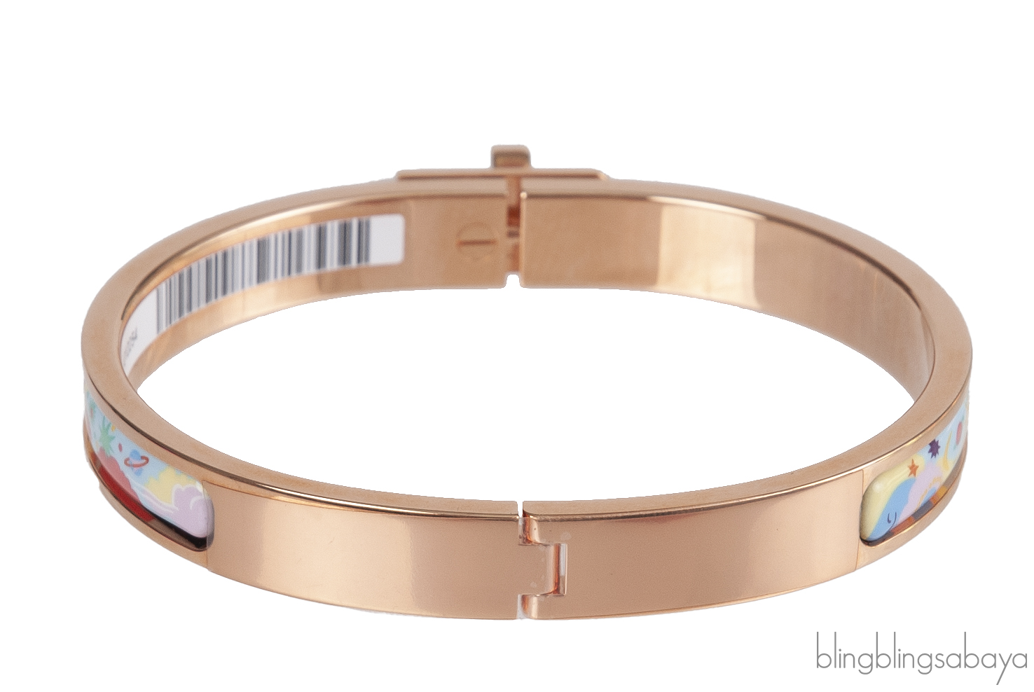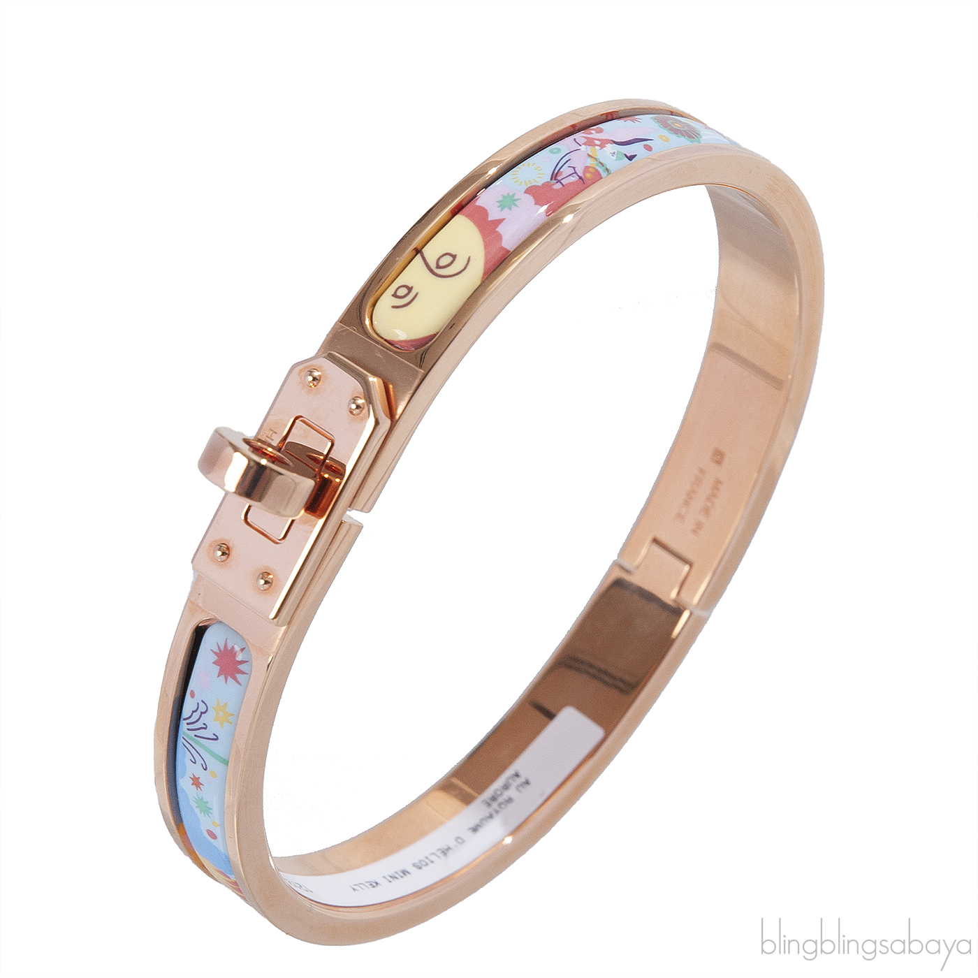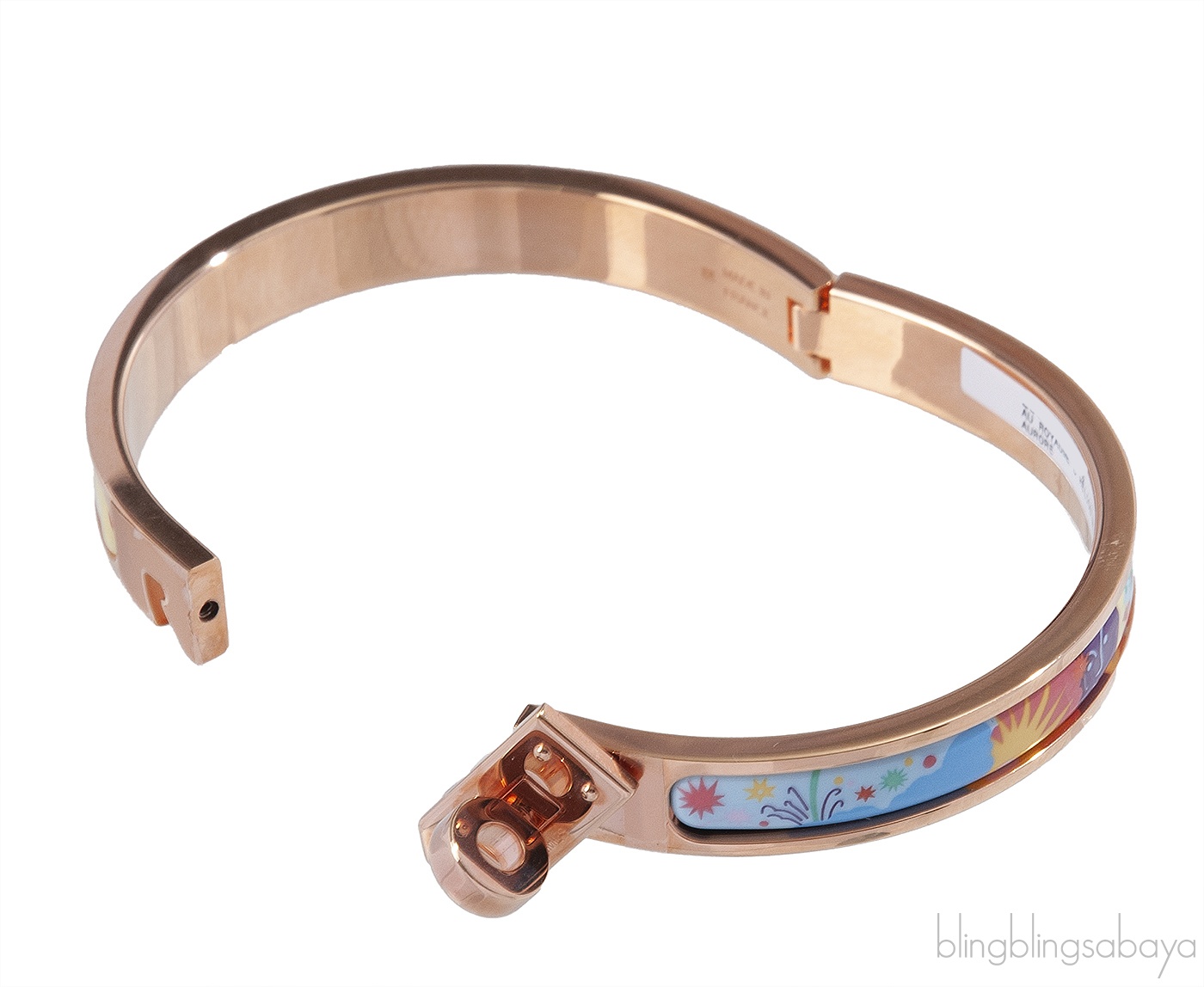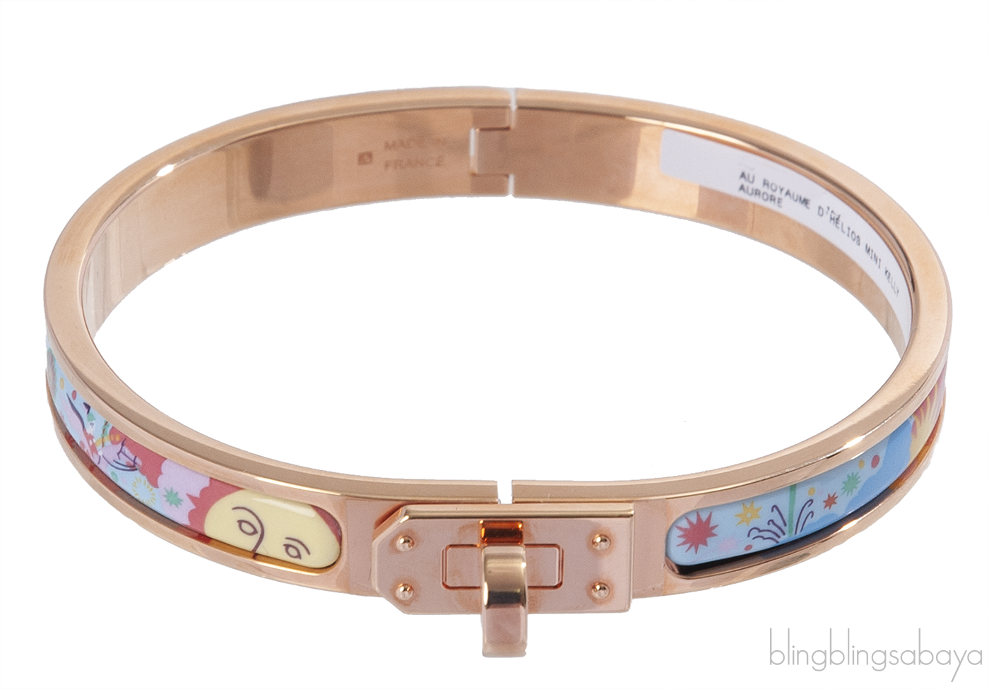 This Hermes Mini Clic Kelly Au Royaume d'Helios Bracelet from Hermes is crafted from rose gold plated metal. This narrow bracelet features a "Au Royaume d'Helios printed enamel with a toggle clasp which reveals the iconic kelly signature.