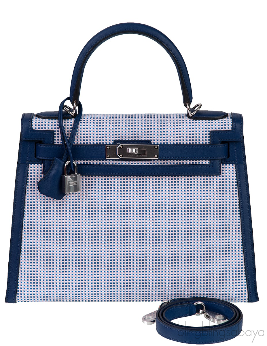 Kelly 28 Sellier Toile Quadrille Veau Swift Ecru-Mauve-Blue