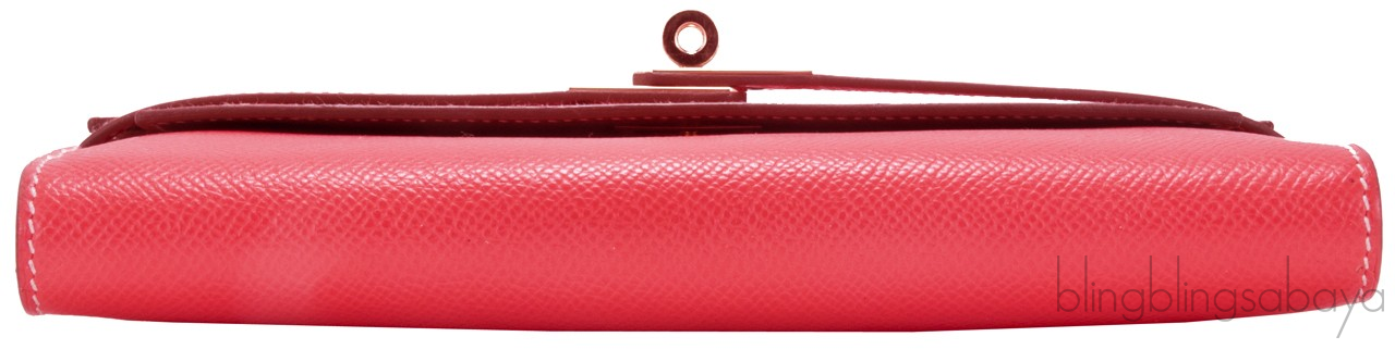 Stunning Kelly Long Wallet from Hermes is crafted in Epsom Leather accented with Golden hardware. This long wallet features a stunning Rose Jaipur hue exterior with Gold Leather Lining. It has two leather clasp that meets on a rotating lock closure that fastened the flap cover. The interior contains two major compartments divided with a zip pocket with golden lock zipper pulls, two slit pockets for bill fold and receipts and has sixteen small pockets for  credt card slots.