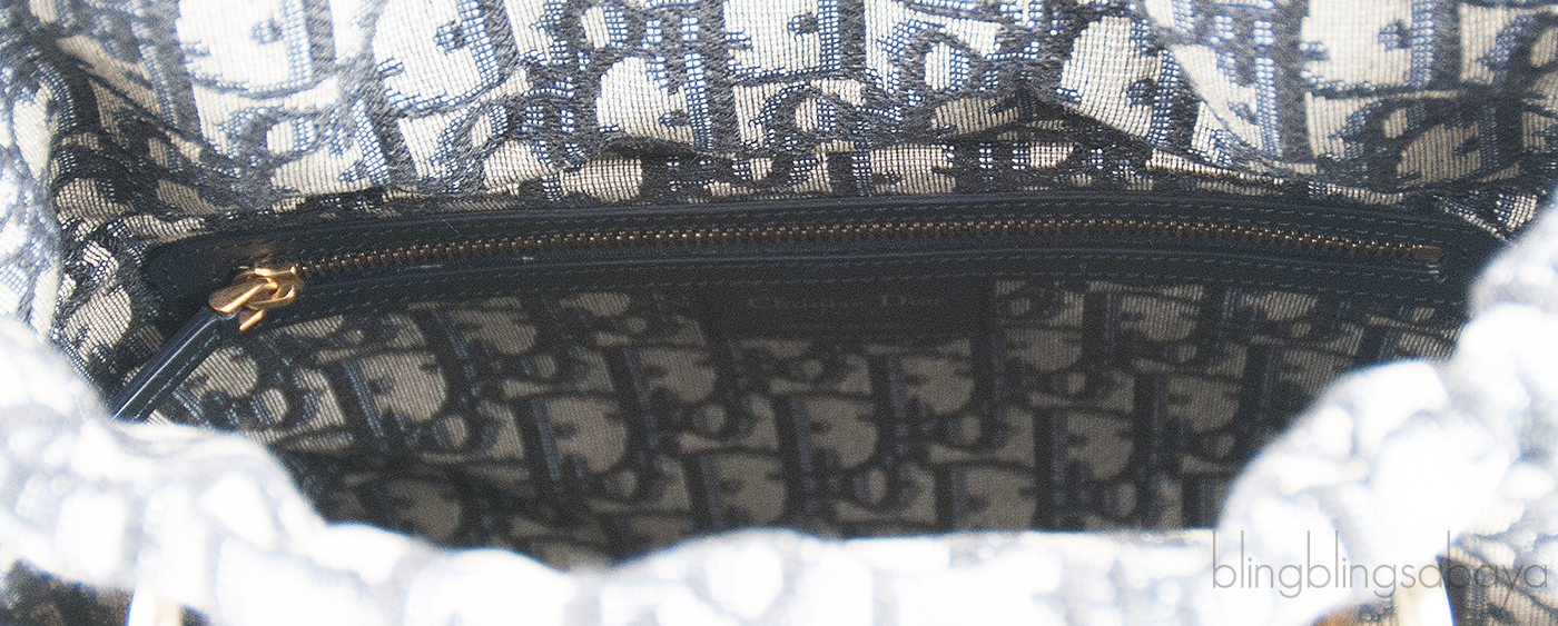 This bag has a blue Dior Oblique jacquard canvas inside pouch with drawstrings, DIOR charms in aged gold metal and has CHRISTIAN DIOR embroidered band on the front. This Lady Dior medium bag can be carried in the hand, on the shoulder, or crossbody thanks to its large removable shoulder strap.