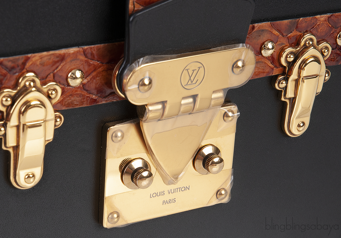 This Black Leather Python Trim Petite Malle from Louis Vuitton is crafted in black leather leather with brown python leather trim acceted with the gold hardware.