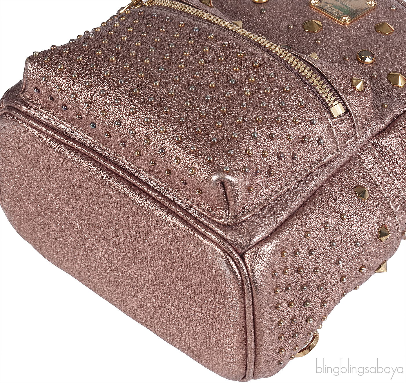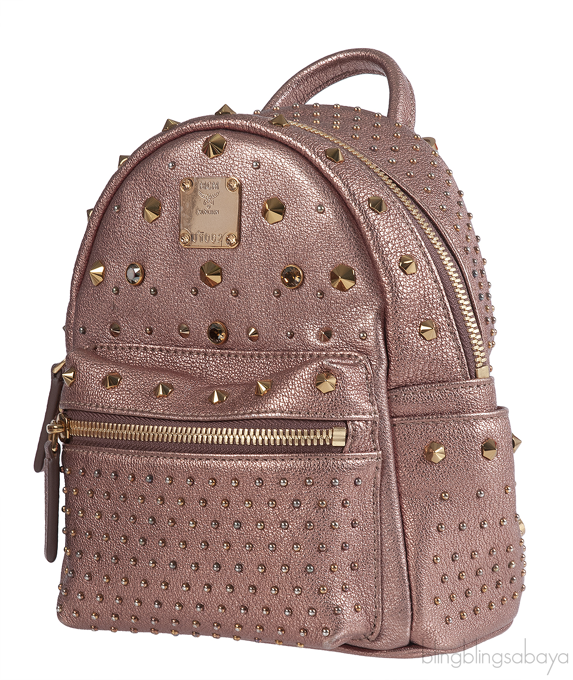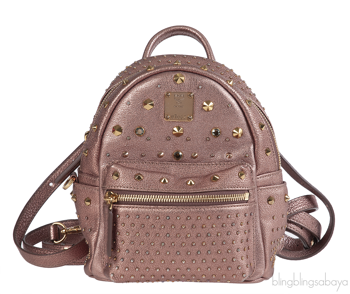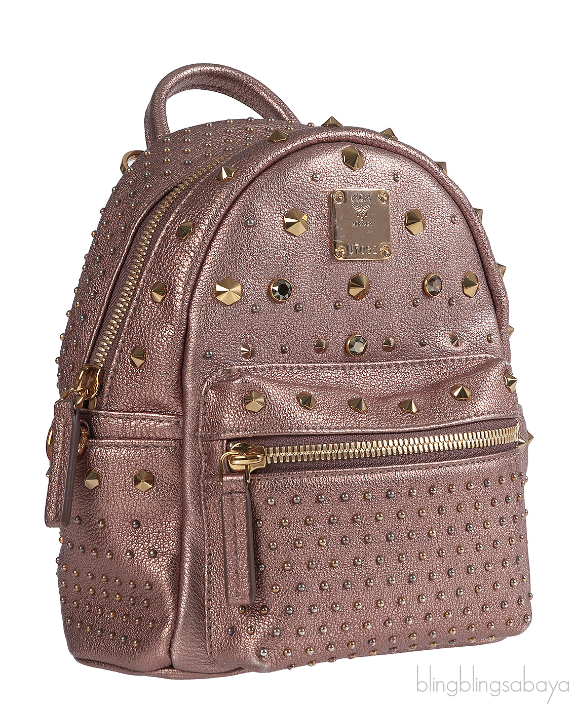This cute and fabulous Metallic Leather Studded Backpack from MCM is crafted from metallic leather accented with the gold hardware. This chic mini bag is embellished with gold crystals and studs and gold logo metal plate at front.
