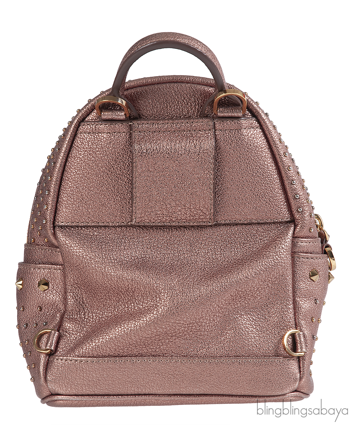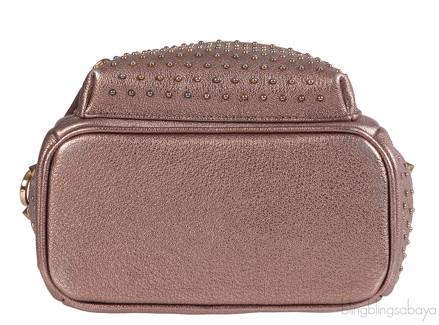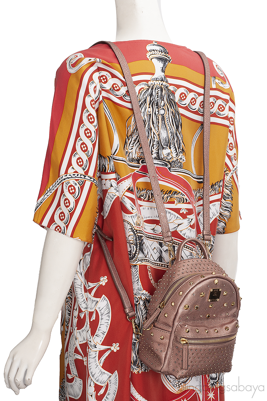 This cute and fabulous Metallic Leather Studded Backpack from MCM is crafted from metallic leather accented with the gold hardware. This chic mini bag is embellished with gold crystals and studs and gold logo metal plate at front.
