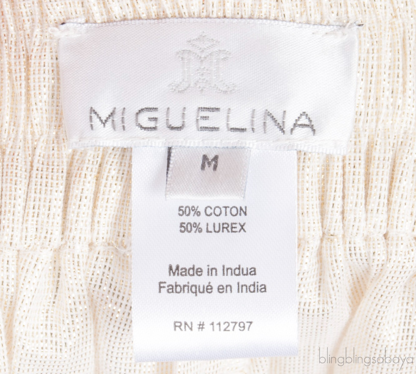 Metallic Wide Leg Trouser is crafted from 50% Cotton and 50% Lurex in white gold mettalix featuring an elastic waistine, wide leg with long slit in both sides, and gold detachable belt.