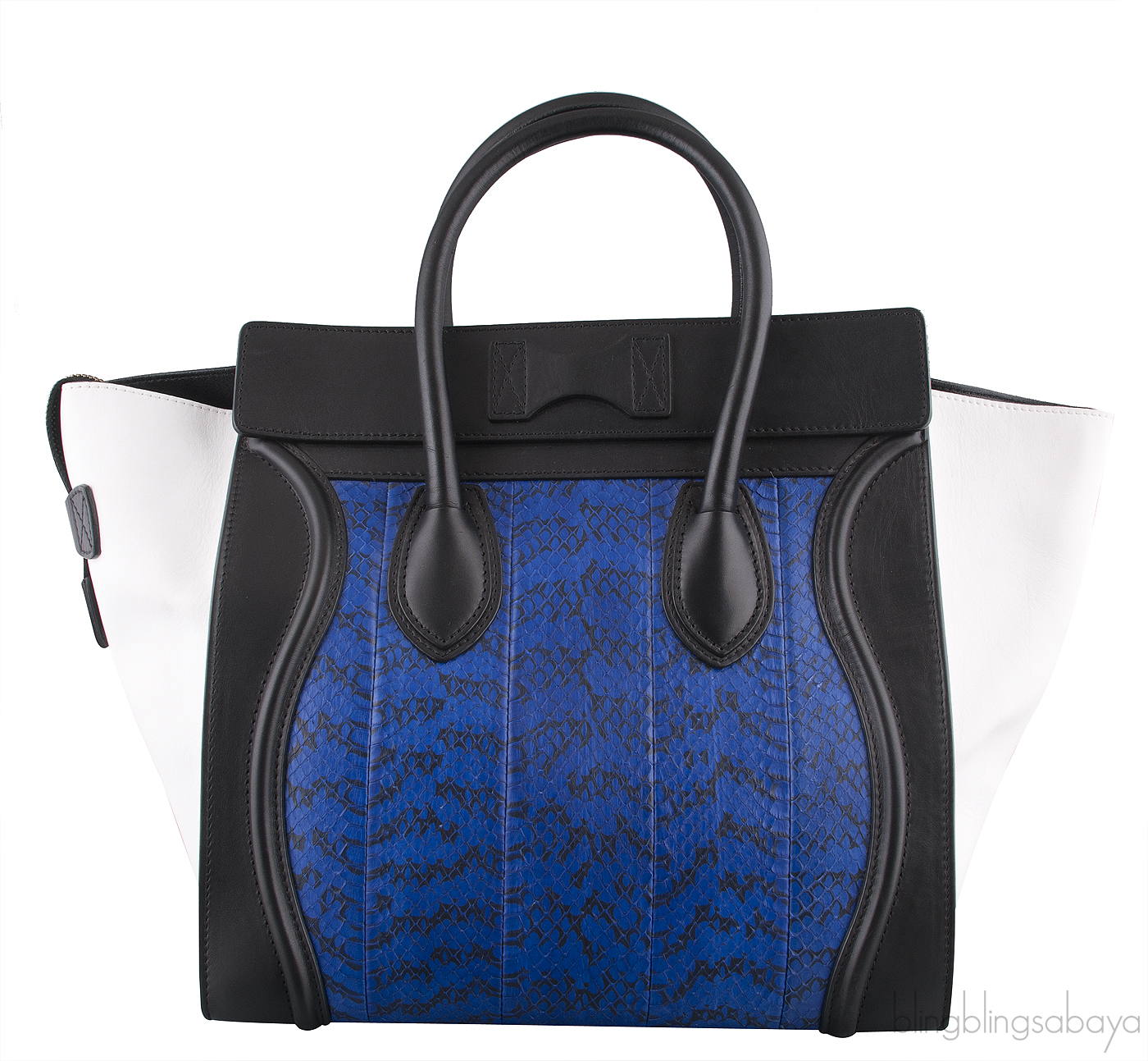 A lasting first impression and one of a kind piece from Celine. This Mini Luggage is impressively crafted in exotic Python Leather mixed with White Leather wings and Black Calf Leather trimming and handles perfectly accented with the Golden Hardware. This features a super cute zippered pocket in a front with matching leather pulls. It has a vertical ridge on both sides that adds a stunning characteristic on front and rear of this lovely bag.