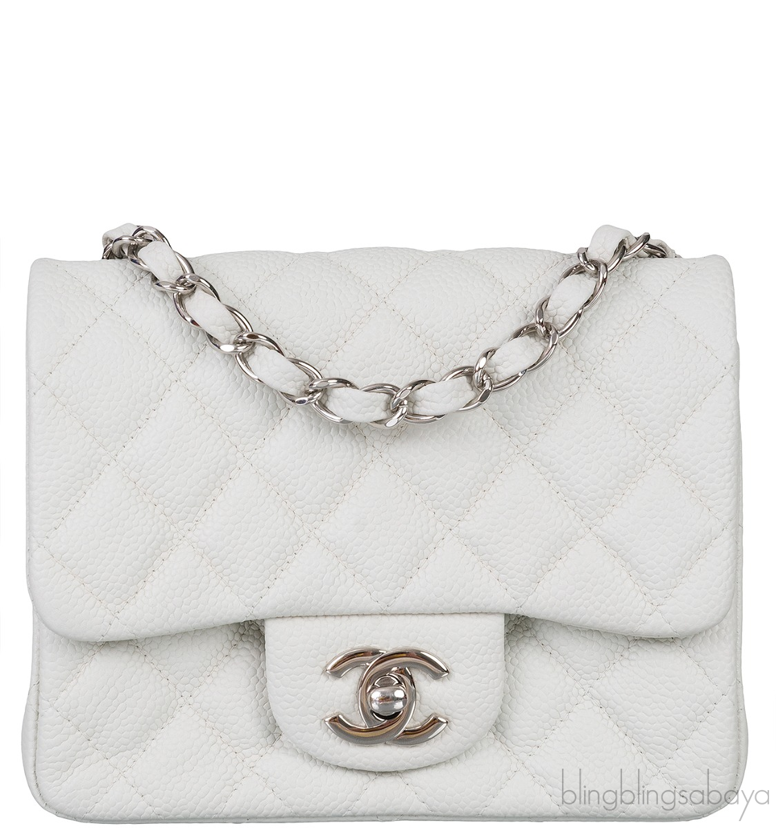 This lovely Mini Off-white Square Shoulder Bag from Chanel is made of off-white matte quilted caviar leather featuring a cute mini size bag with flap cover, CC turn lock closure in silver and has long intertwined shoulder strap.