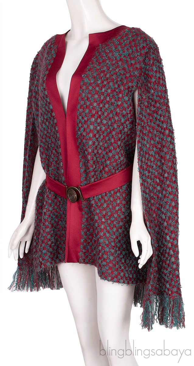 This Mohair Bi-color Poncho from Vanessa G. is crafted from Mohair fabric in green and maroon hue. Featuring a round neckline, hook fastening at front, belt with gold antique buckle, cape sleeves, printed satin lining and fringed hemline.