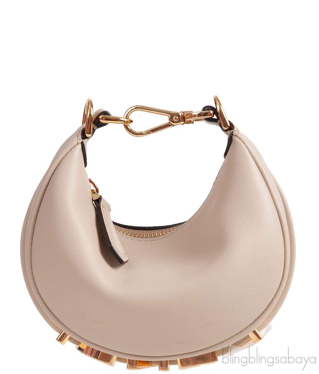 This Fendigraphy Nano edition hobo bag features a zip closure, adorned with classic gold-colored metal FENDI writing and comes with hooks for shoulder straps. You may wear it on your wrist or attach it to larger bags thanks to the adjustable strap that has a clip.