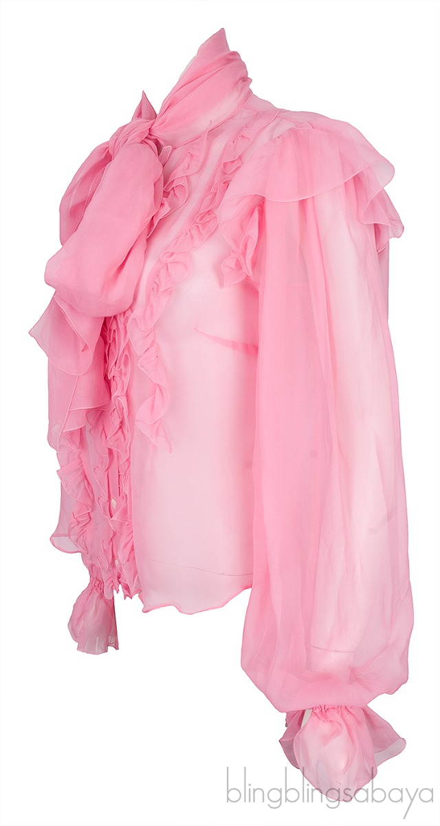 This Pink Sheer Shirt from Dolce & Gabban features a pink sheer fabric featuring a cute pussy-bow, button fastening and ruffles detailing at front, long sleeves with elastic cuffs and ruffled trim