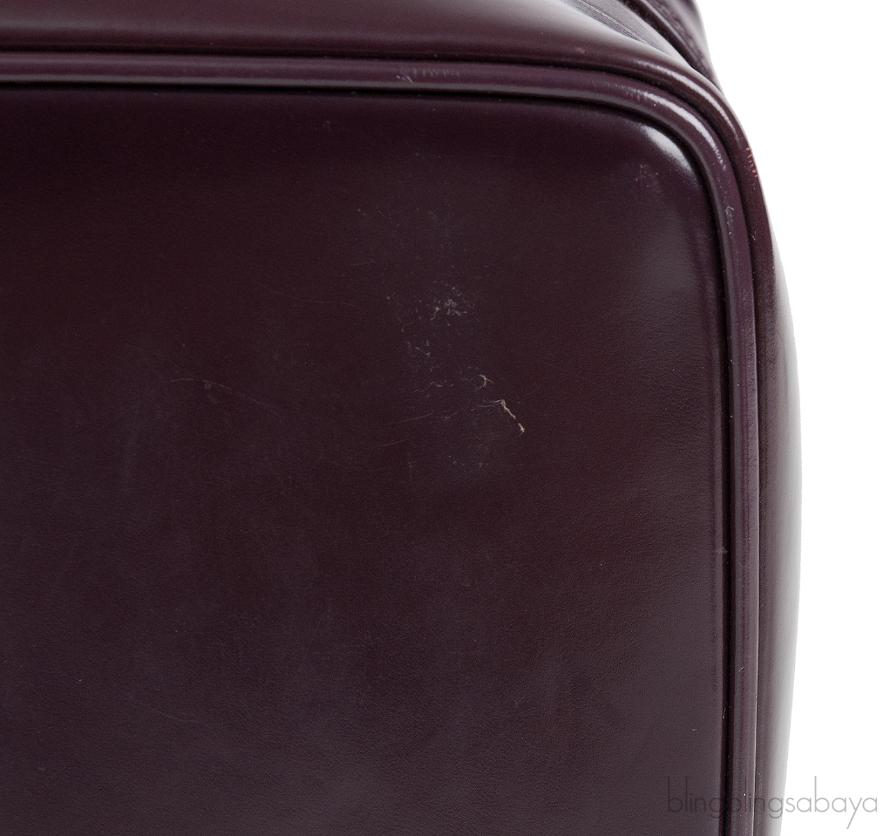 This Plum Vanity Leather Bag from Gucci is crafted from plum smooth leather accented with the gold hardware. This vanity bag features a top flat leather handle, gucci engraved at the top, zip opening with bamboo zipper pulls, and has very roomy interior fully lined with black leather and has no pocket inside.