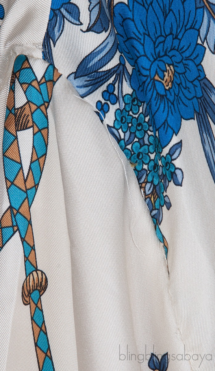 This Printed Silk Kimono Top from Gucci is crafted from 100% silk fabric in off-white with multicolor print and yellow trim. This top features a kimono sleeves, open front, one hook fastening with detachable belt, and two pockets at front.