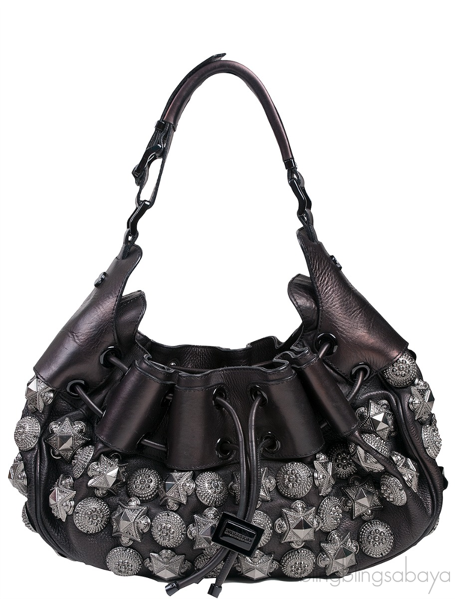 This Prorsum Leather Mason Warrior Bag from Burberry is crafted from black textured with smooth leather trim accented with black and gun metal hardware. This bag features a drawstring fastening at front with metal push lock closure, adjustable flat single leather strap and accented with gunmetal studs at front through the back.