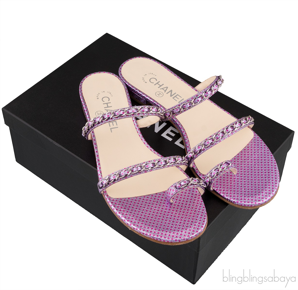 These Purple Chain Polkadot Sandals from Chanel is crafted from purple polka-dot printed leather and off-white leather lining. These sandals features a strappy upper with intertwined chain and leather, leather insole and leather sole.