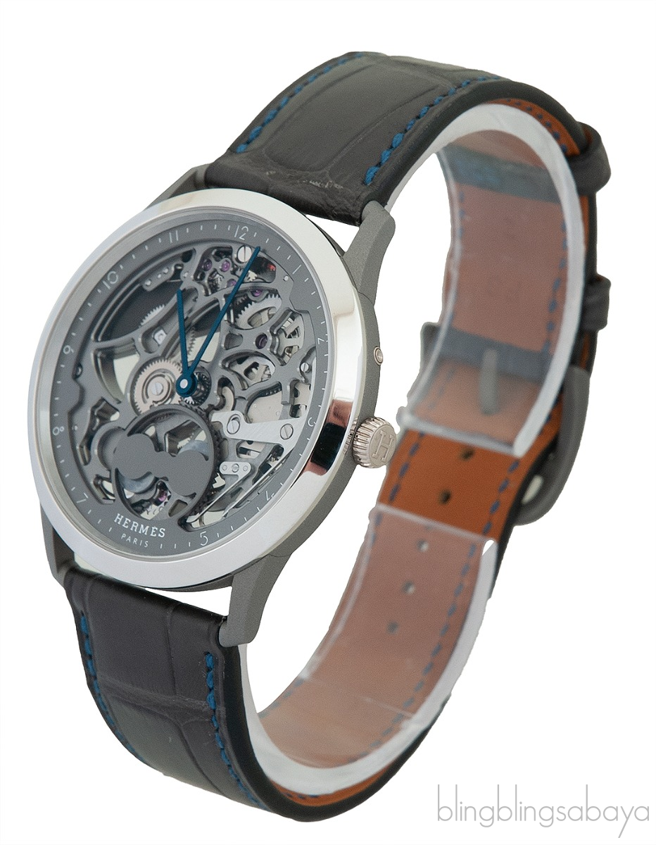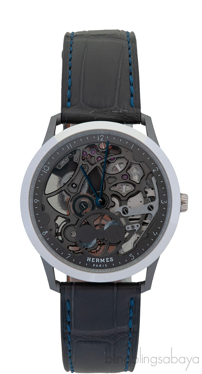 This Slim d'Hermès Squelette Lune Noire Watch from Hermes features a case made of titanium and platinum measuring 39.5 mm diameter. This watch has anti-glare sapphire crystal surface with back case skeleton dial.