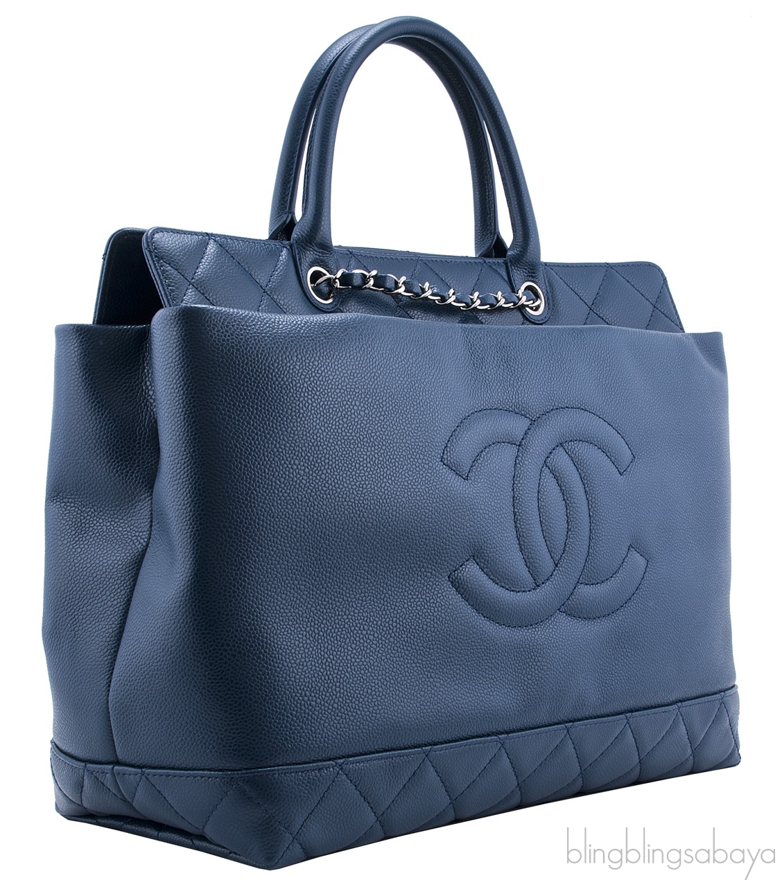 This sophisticated Timeles CC Large Tote is made of Navy Blue Caviar Leather embossed with Large Chanel CC signature logo in the front. This charming tote features two leather handles and a classic style chain with Silver Tone Hardware.