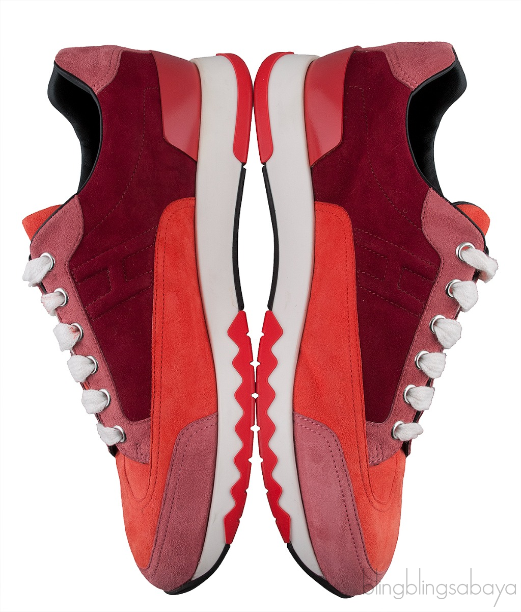 This Trail Sneaker from Hermes is crafted from multicolour suede leather upper with black leather lining. These sneakers features a siz pairs of riverts with white shoe laces, embossed H logo on the sides, black goat skin insole and lining, orange zigzag rubber insert on the front and orange rubber insert on the back, white rubber midsole and black rubber sole.