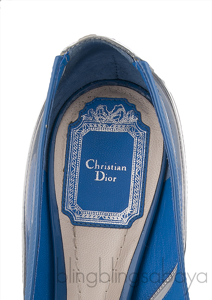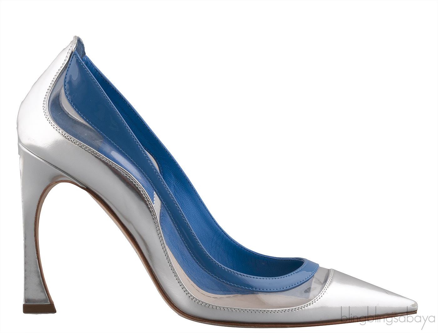 These Two-toned PVC Pointed Toe Heels from Christian Dior is crafted in blue and silver patent leather with PVC accent featuring a pointed cap toe, nude leather insole, slender silver heels measuring 100 mm high and leather outsole.