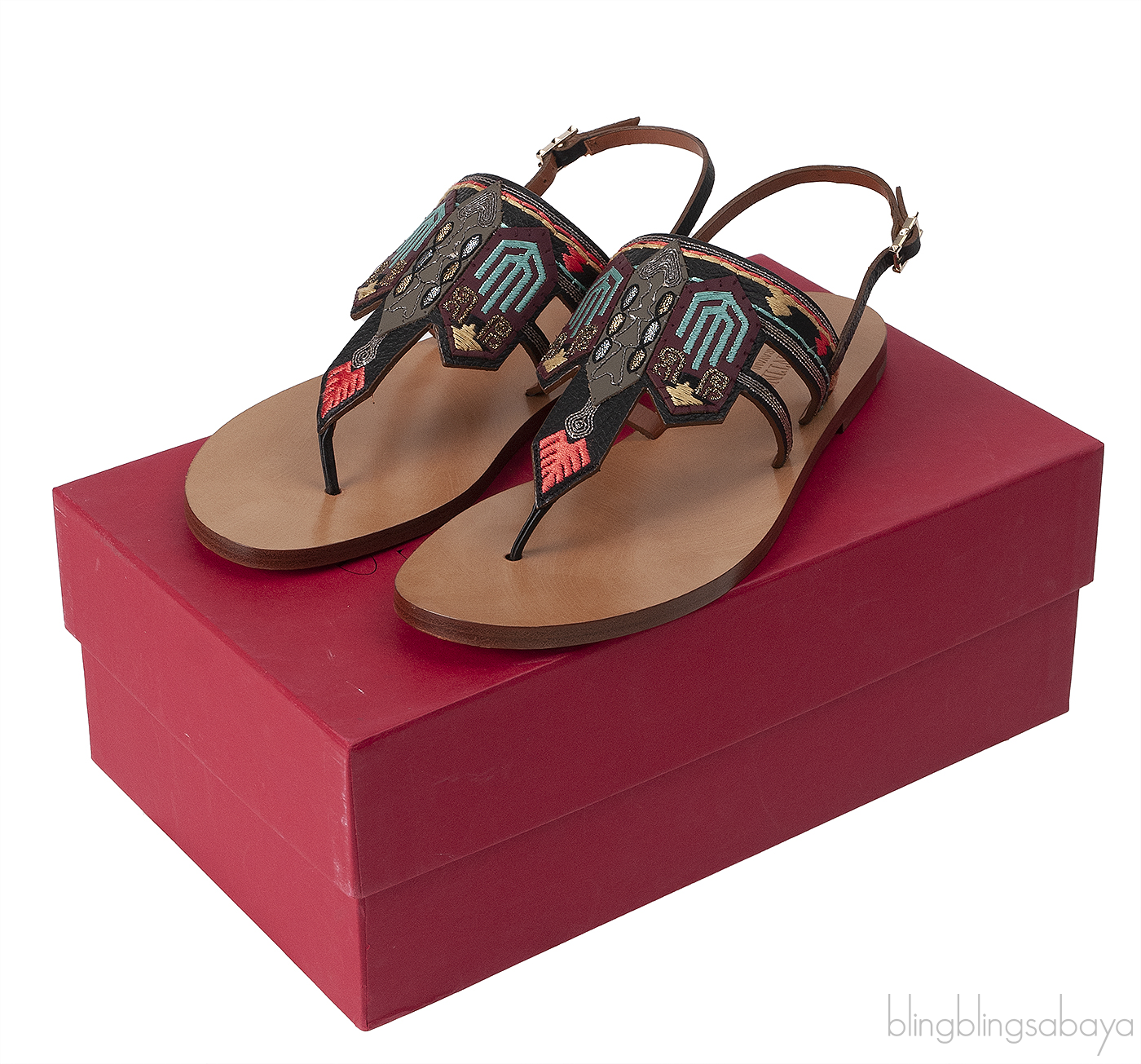 This so comfortable Multi-color Slip On Sandals from Valentino Garavani is crafted in black leather upper with multi-color ethnic design on the vamp, sling back with buckle fastening, brown leather insole and sole.