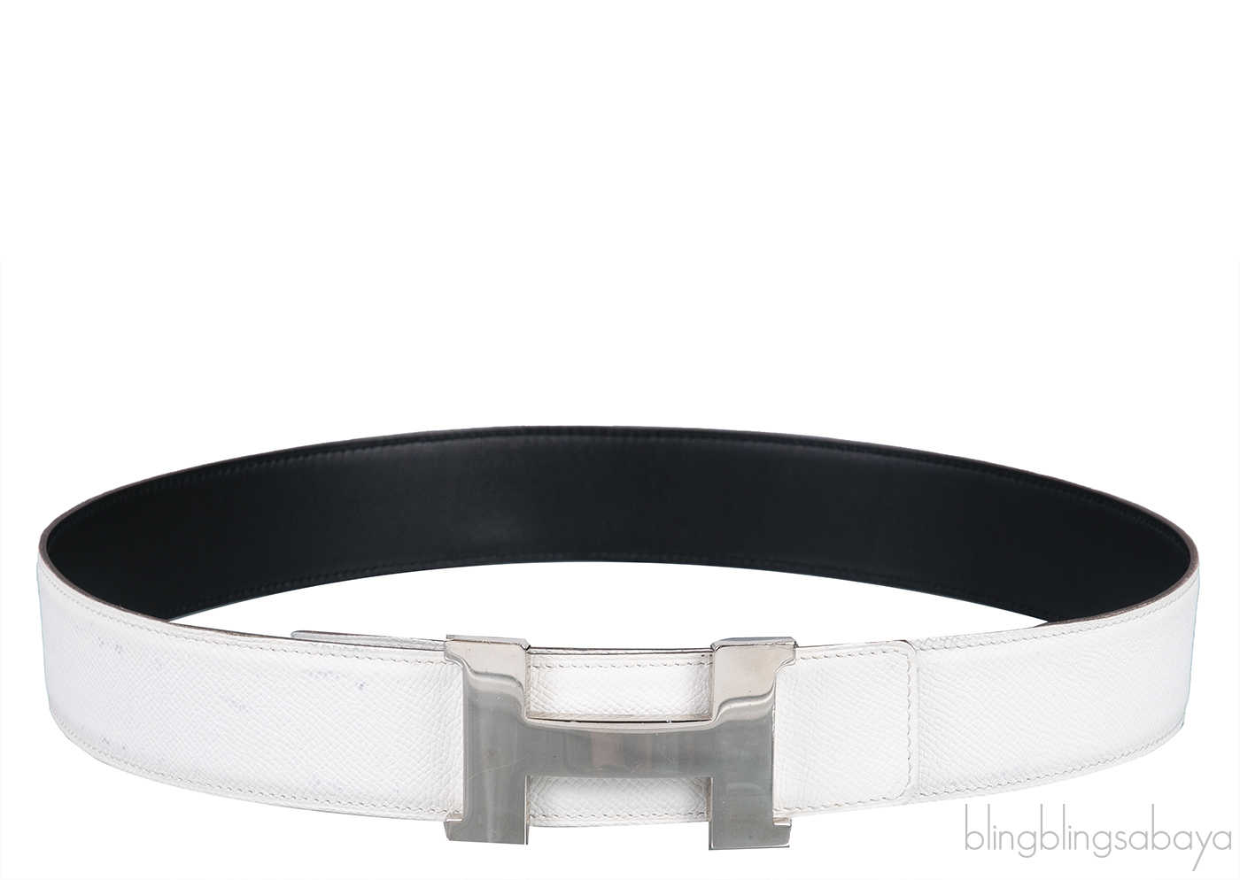 This White Epsom "H" Reversible Belt from Hermes is crafted from white epsom leather with black smooth leather on reverse. This belt features a silver detachable "H" buckle and several holes on the belt strap for size adjustment.