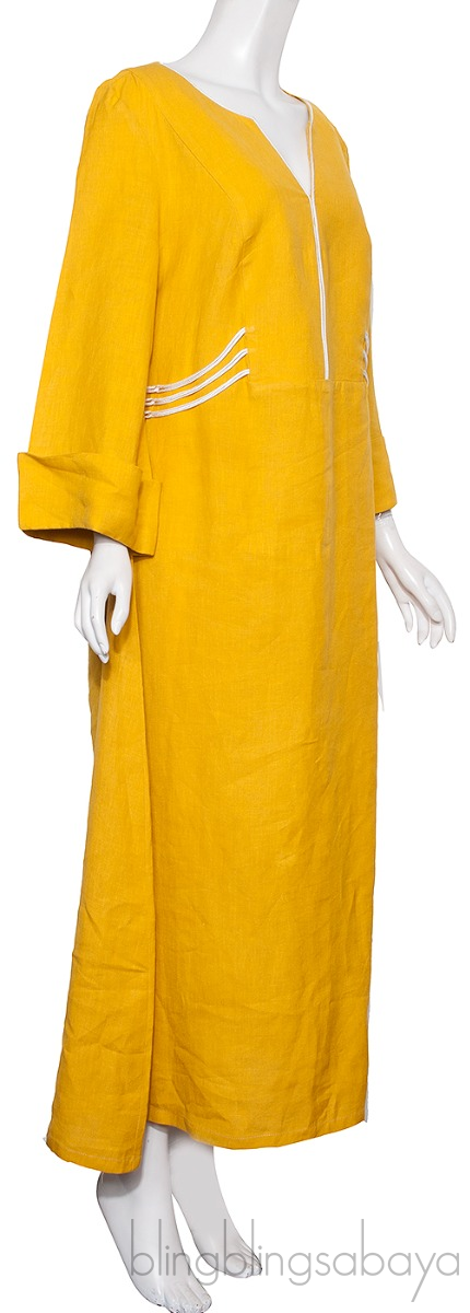 This Yellow Hydra Linen Kaftan form Zeus + Dione is crafted from 100% Linen in yellow hydra color. This kaftan dress features a breezy linen fabric with white cord trim accentuating the V-neck and cinching in the relaxed waist, long sleeves with folded cuffs and zip fastening at rear.