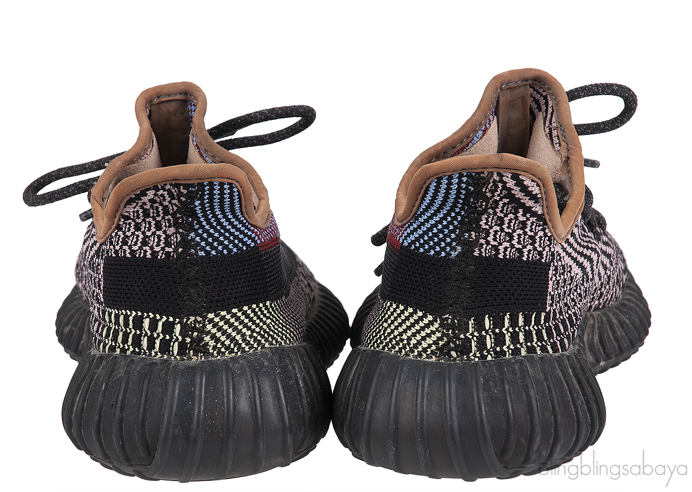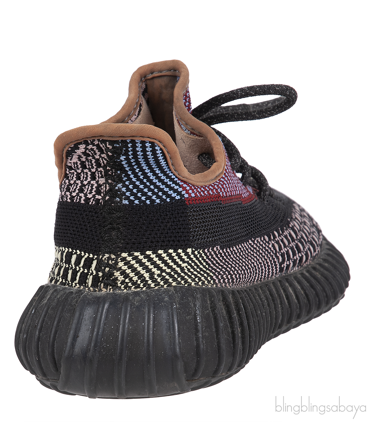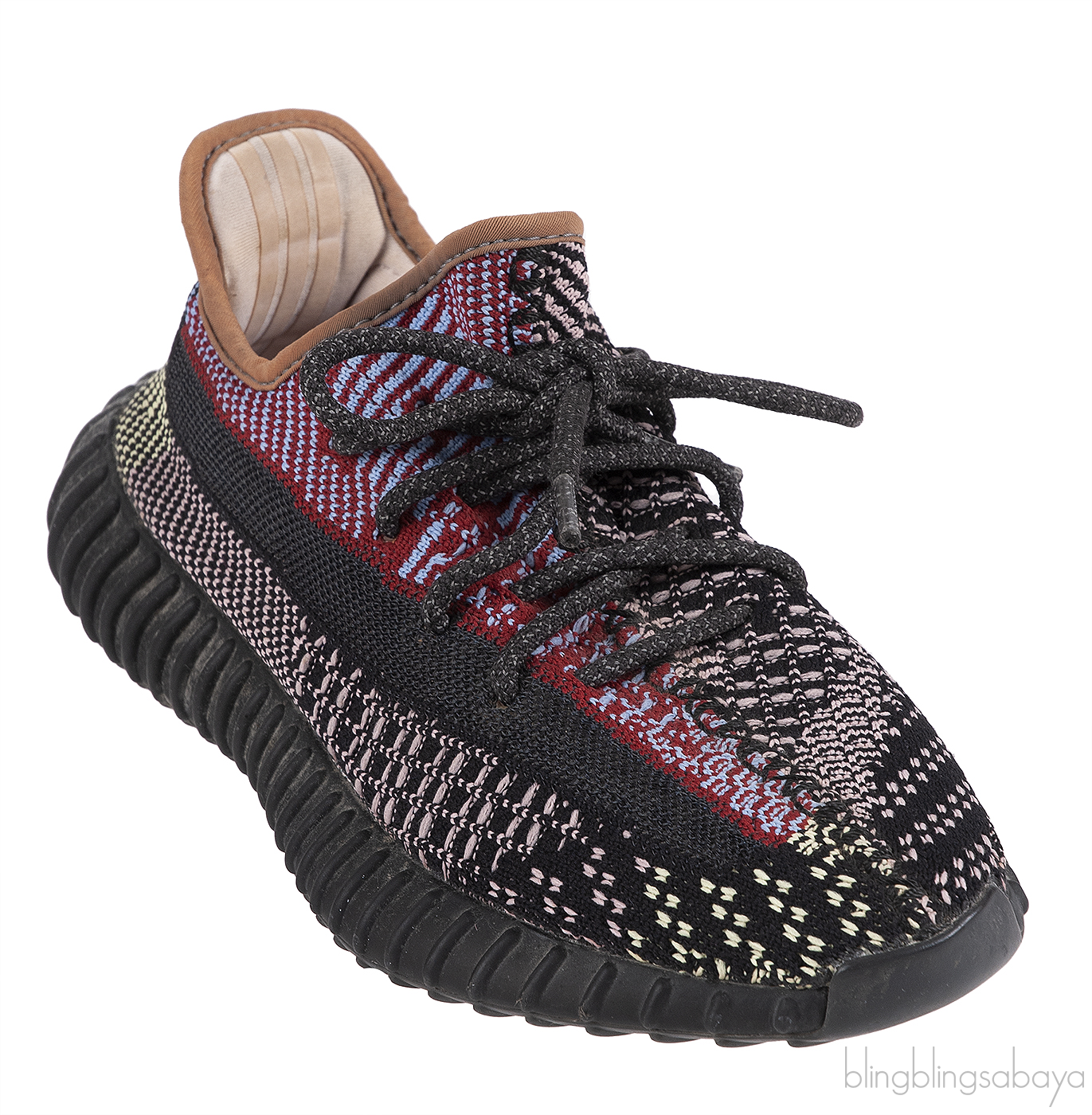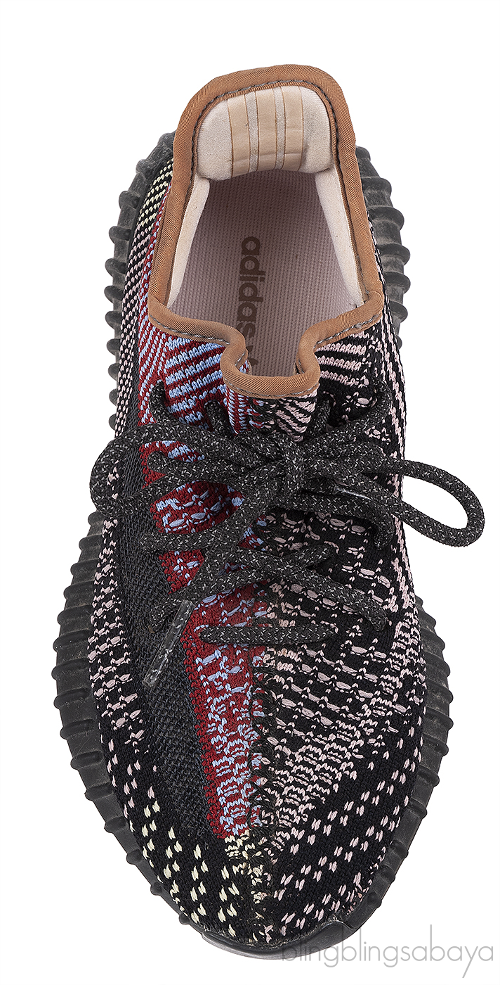 The Adidas Yeezy Boost 350 V2 Yecheil FW5190 features a multi-color Primeknit upper that blends shades of red, black, blue, green and yellow for a bold look. It includes a reflective side stripe for added visibility in low light, along with matching shoe laces for a secure fit. The shoe is equipped with Boost cushioning for superior comfort, and the semi-translucent rubber outsole enhances both traction and style.
