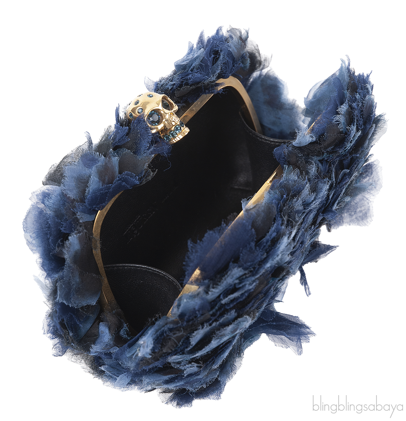 This Skull Fabric Embellished Hard Clutch from Alexander McQueen features a hard case oval shape fully covered with tri-color oraganza fabric that create a brilliant feather-like effect. This clutch has gold and blue-toned crystal-embellished skull clasp at top, a gold tone metal frame and the interior is fully lined with black leather.