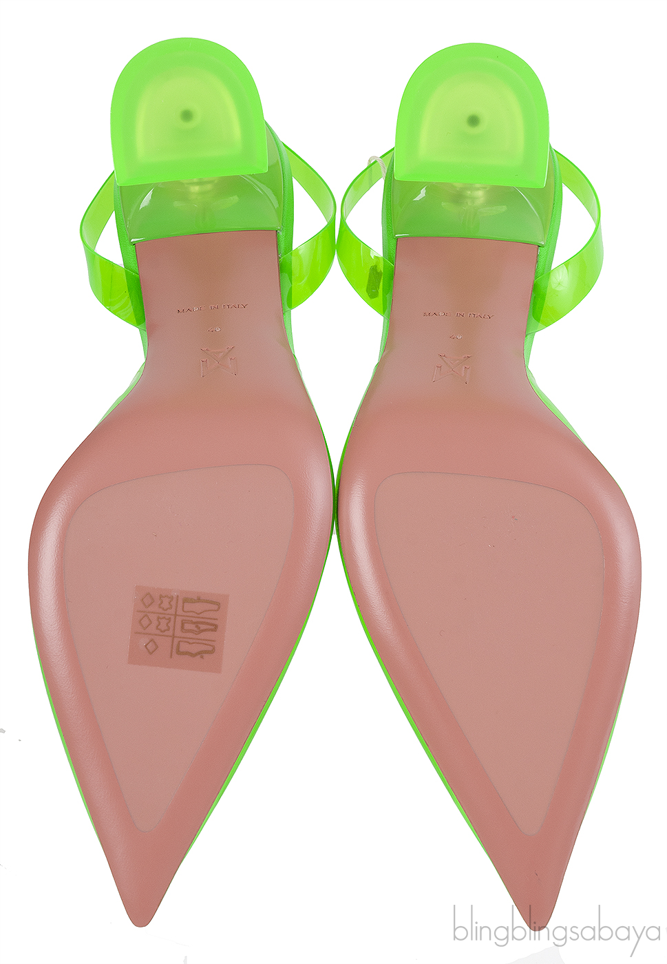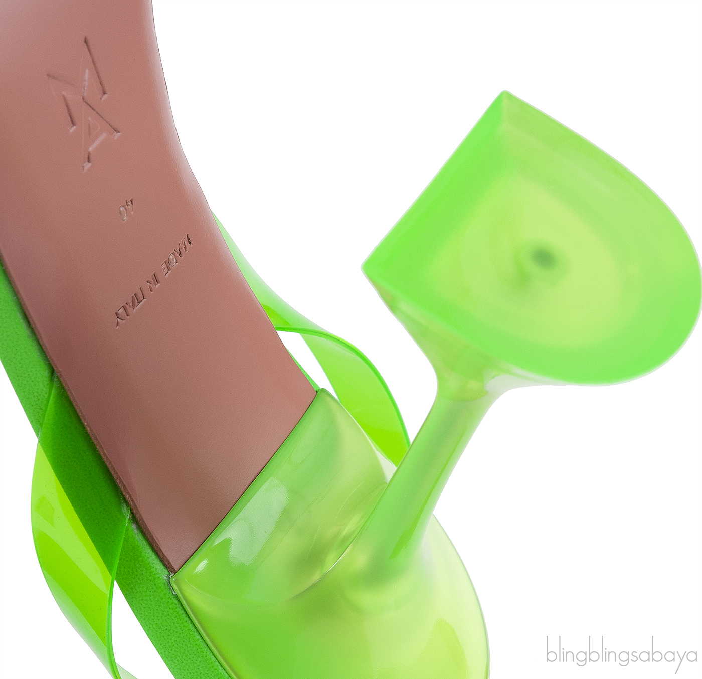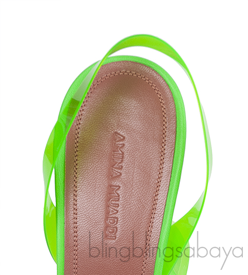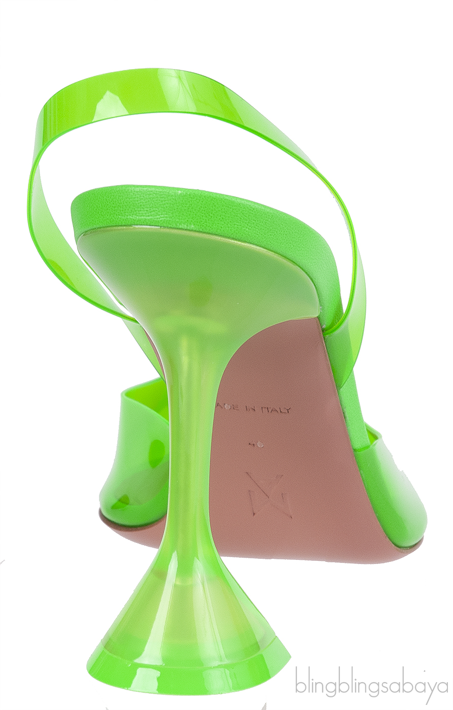 This pair of AMINA MUADDI Holli 95 PVC Glass Green Slingback Pumps are crafted in innovative green transparent PVC upper featuring a sharply pointed toe, slingback, leather lined insole and architectural structure heel measuring 95 mm high.