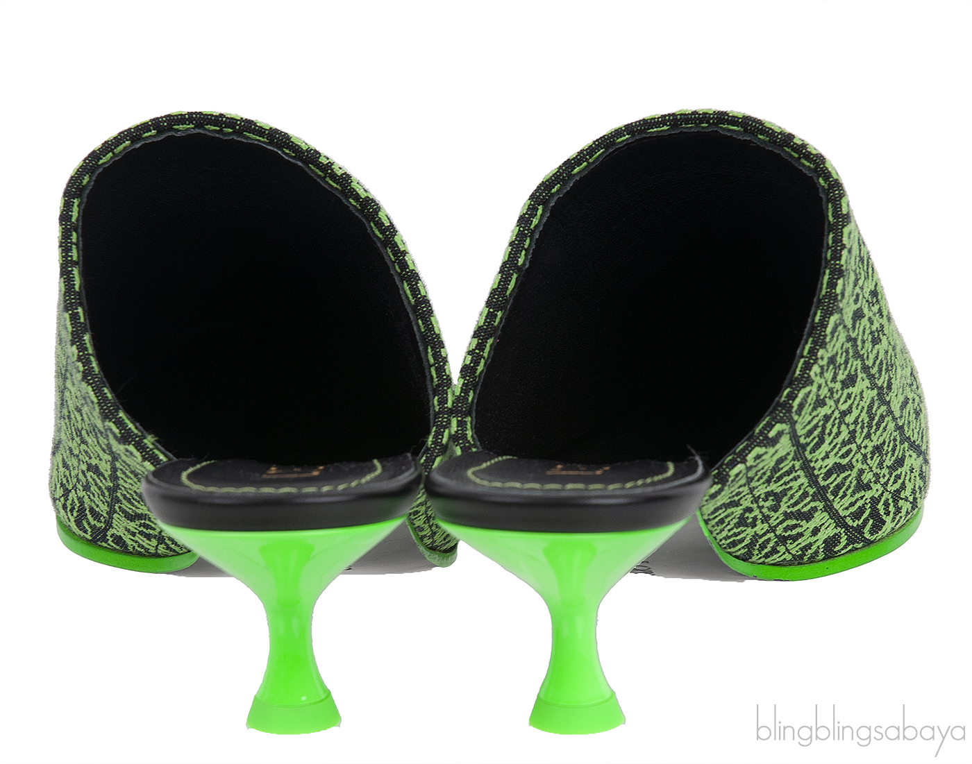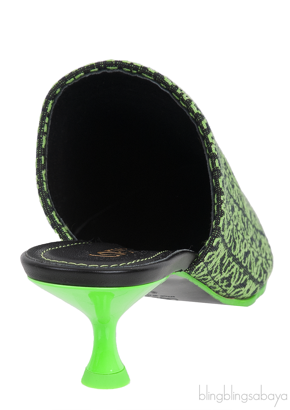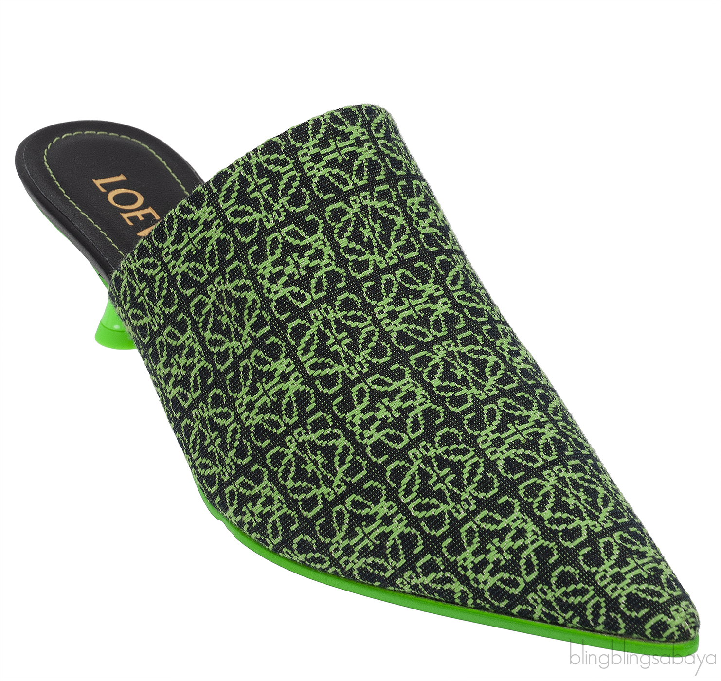 These Anagram Embroidered Fabric Pointy Mules from Loewe are crafted from fabric upper with leather lining. These mules features a pointed toe, anagram embroidered design,, slip on, leather lined insole and sole and green mini kitten heels.