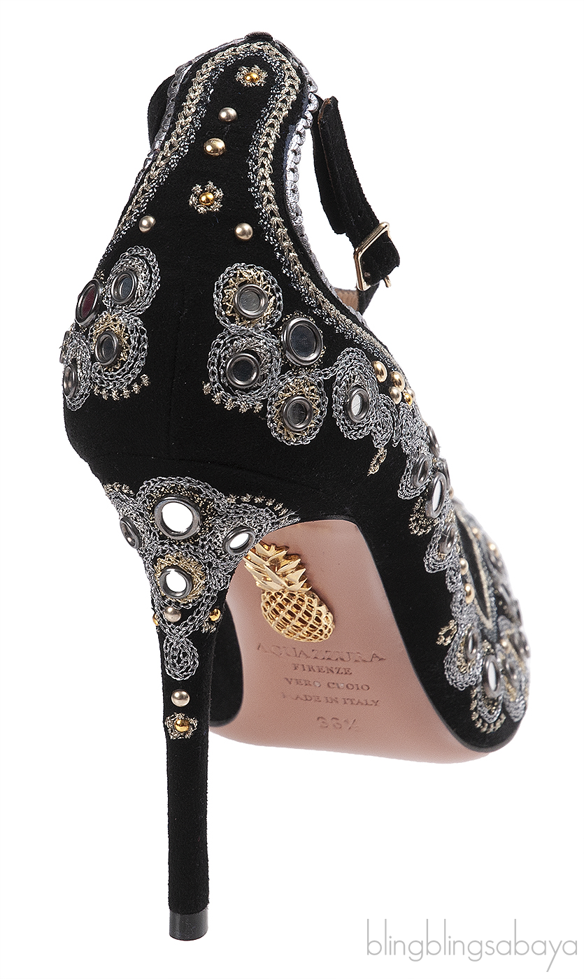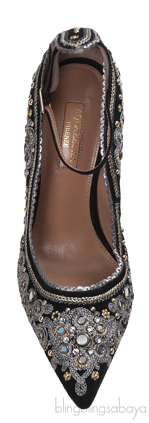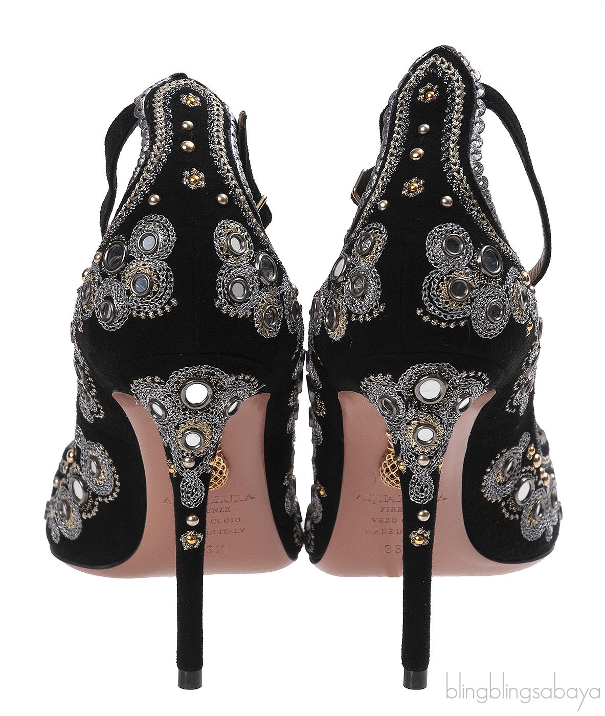 These Black Embellished Jaipur Pumps from Aquazzura from black suede upper decorated with bright mirrored and embroidered embellishment and leather lining. These heels features a pointed toe, buckled ankle straps, and are set on slim stiletto heels for a leg-lengthening effect.