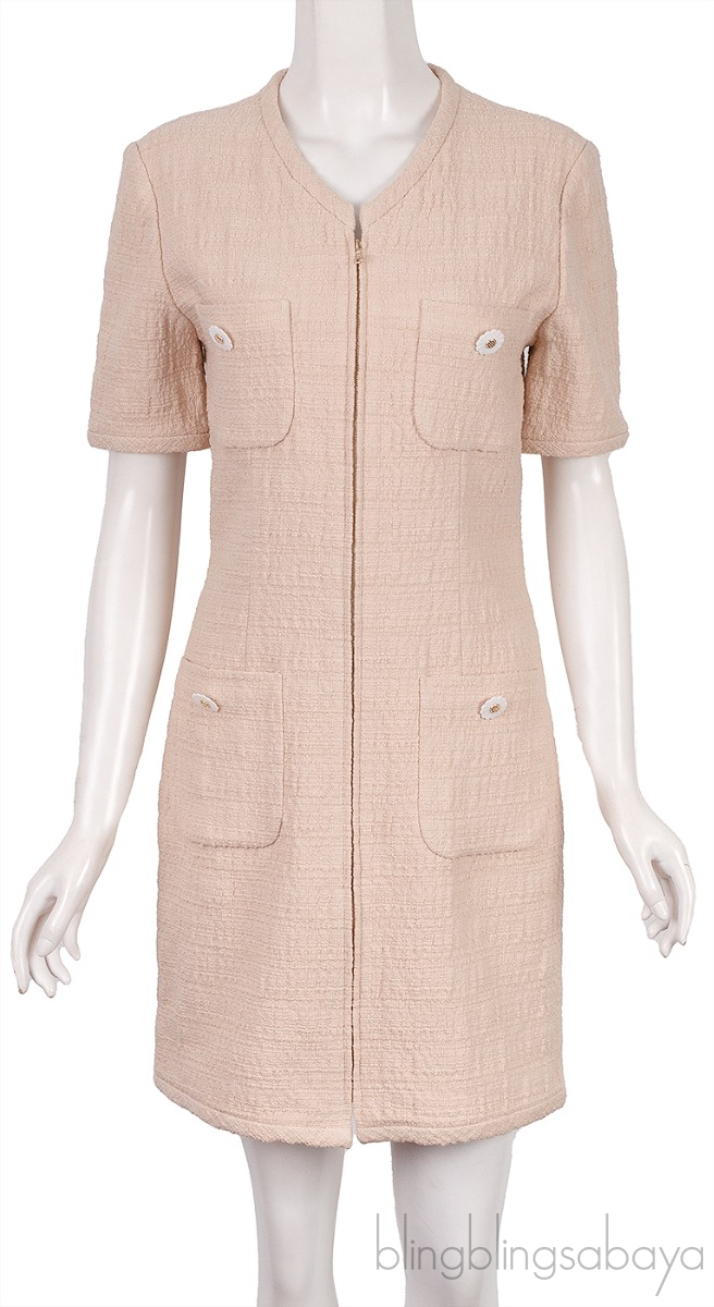 This Beige Front Pocket Flower Button Dress from Sandro is crafted from 93% Cotton, 5% Viscose and 2% Elastane. This dress features a round neckline, short sleeves, front pockets at front with floral button, and mini length.