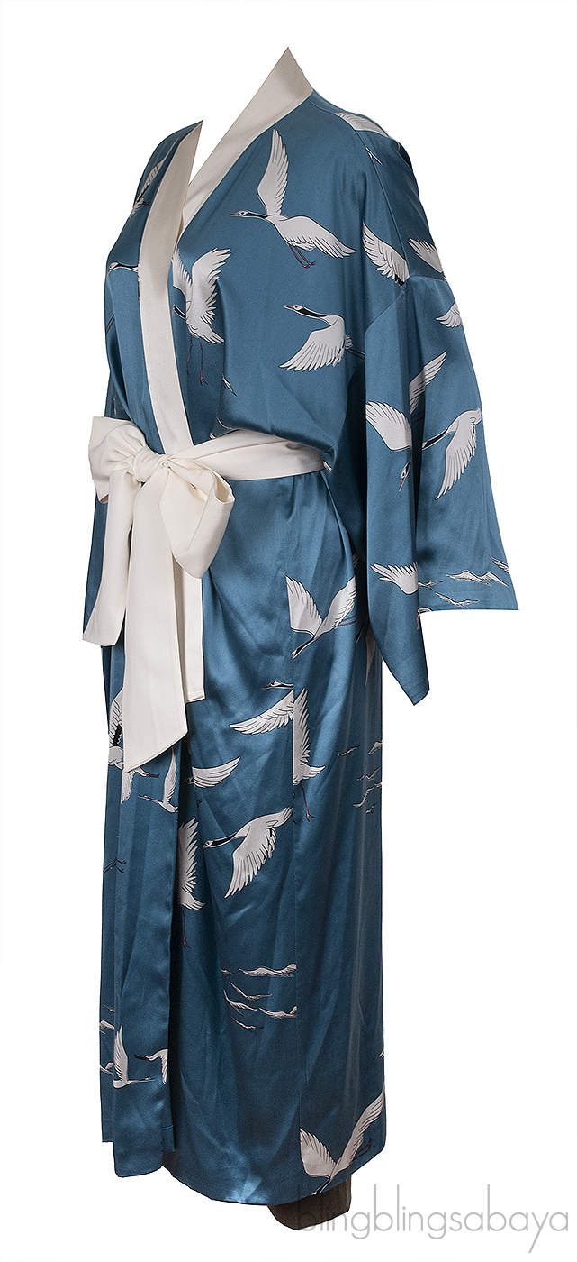 This Olivia Von Halle Bird Print Blue Kimono is crafted from 100 % blue silk fabric decorated with birld print. This features an open-front desing, long sleeves and mid-length hem. contrasting wide off white belt.
