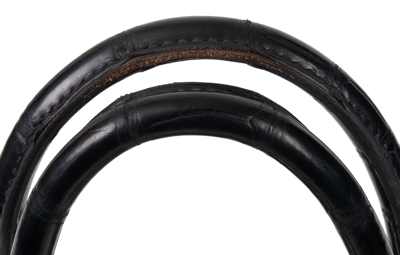 This piece features two rolled leather handles that allows to carry on a hand or under your elbow. The roomy interior is lined with coordinating leather that features one zippered pocket and one open patch pocket.