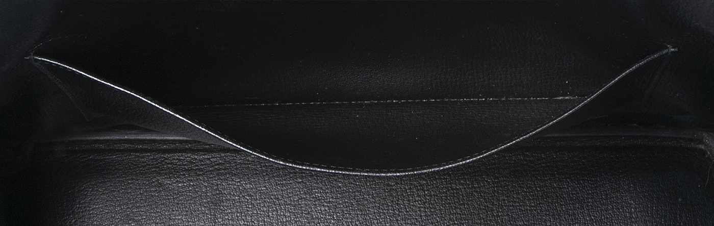 This features two rolled leather handles that allows to carry on a hand or under your elbow. The roomy interior is lined with coordinating leather that features one zippered pocket and one open patch pocket.