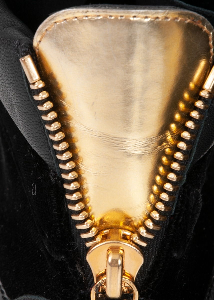 These Black Coby High Cut Sneaker from Giuseppe Zanotti features a velvet upper with patent leather inserts and a rubber sole, a gold metal logoed double strap. gold-colored zipper details on the upper, lace-up closure.