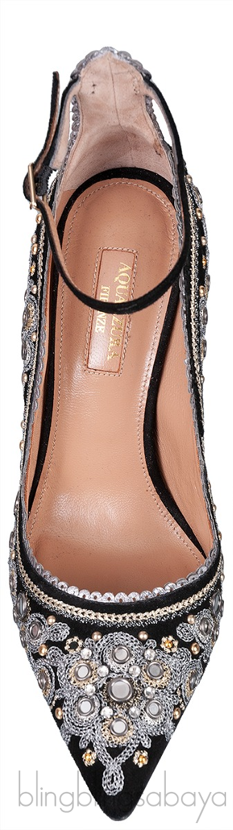 These Black Embellished Jaipur Pumps from Aquazzura from black suede upper decorated with bright mirrored and embroidered embellishment and leather lining. These heels features a pointed toe, buckled ankle straps, and are set on slim stiletto heels for a leg-lengthening effect.