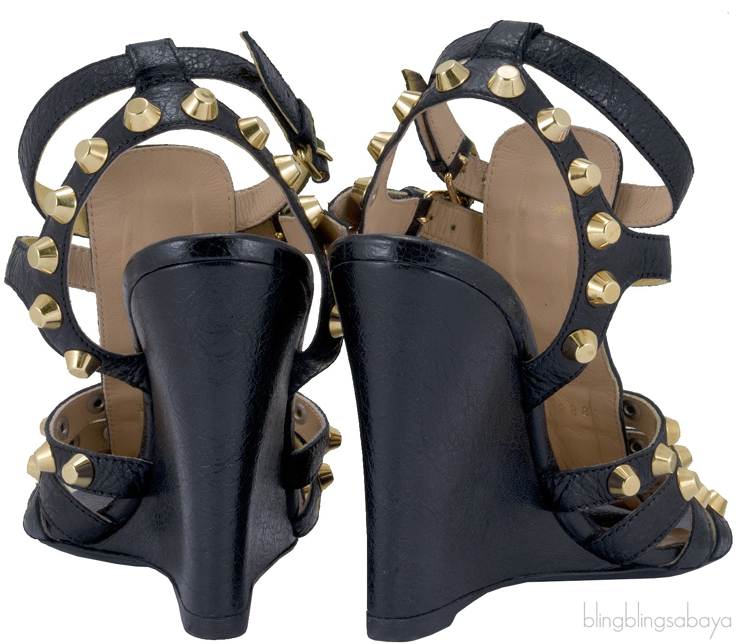 This Black Leather Studded Wedge Sandals from Balenciaga is crafted in Black wrinkled lambskin leather with beige leather lining. This exciting gladiator wedge features a strappy leather upper embellished with the golden studs, round toe, leather covered wedge heel measuing 110 mm and double adjustable ankle straps.