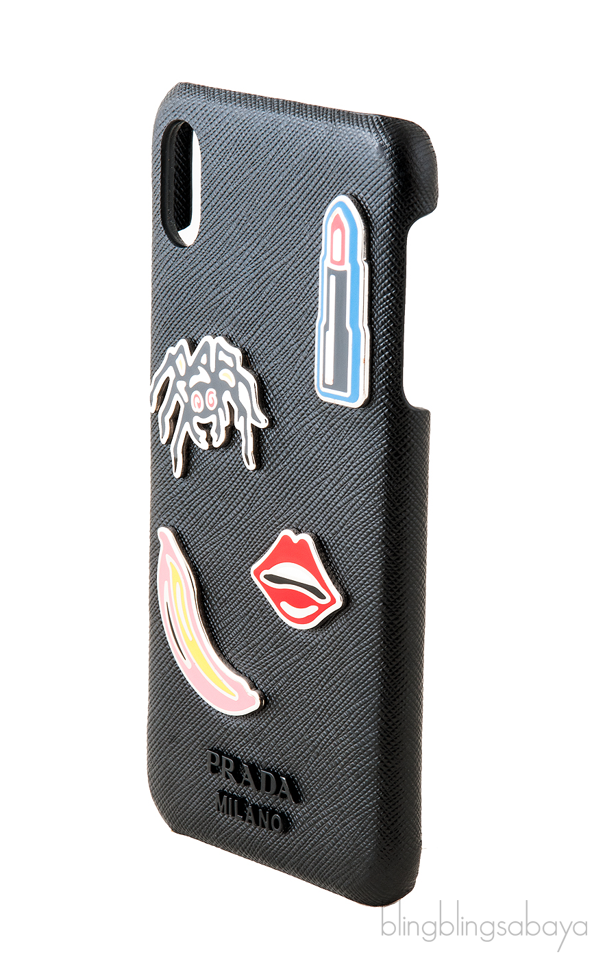 Cover your iPhone with this stylish Black Saffiano iPhone XS Case from Prada. This case is crafted in black saffiano leather featuring a noticeable enameled metal banana, spider, lipstick & lips appliqué. Fits iPhone XS Max!