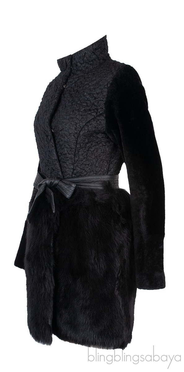 This Black Pelle Leather Coat from DROMe is crafted from 100% Pelle Leather with 52% Acetate and 48% Viscose lining. This coat features a high neckline, button fastening at front, long sleeves and faux hair detailing with detachable black leather belt.