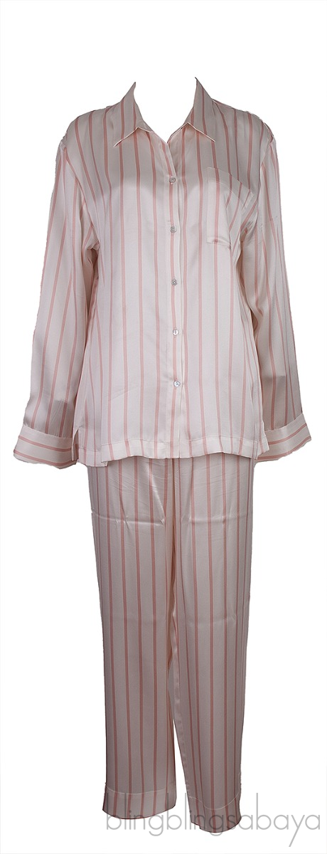 This pair of Blush Stripe Pajama Set from Asceno is crafted from 100% Silk fabric in blush color with white stripe design. Top features a classic collar, button fastening through the front and long sleeves with button cuffs. Trouser features an elastic waistline at rear and lose fit.