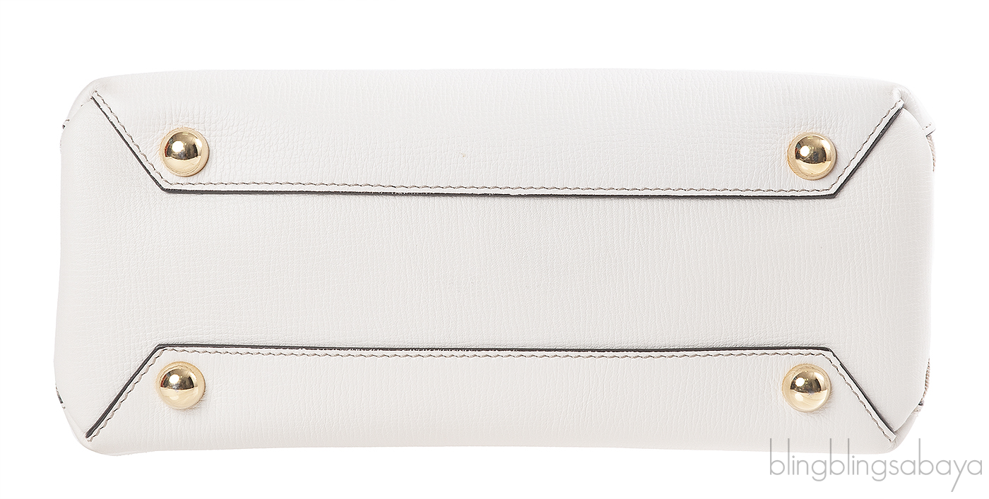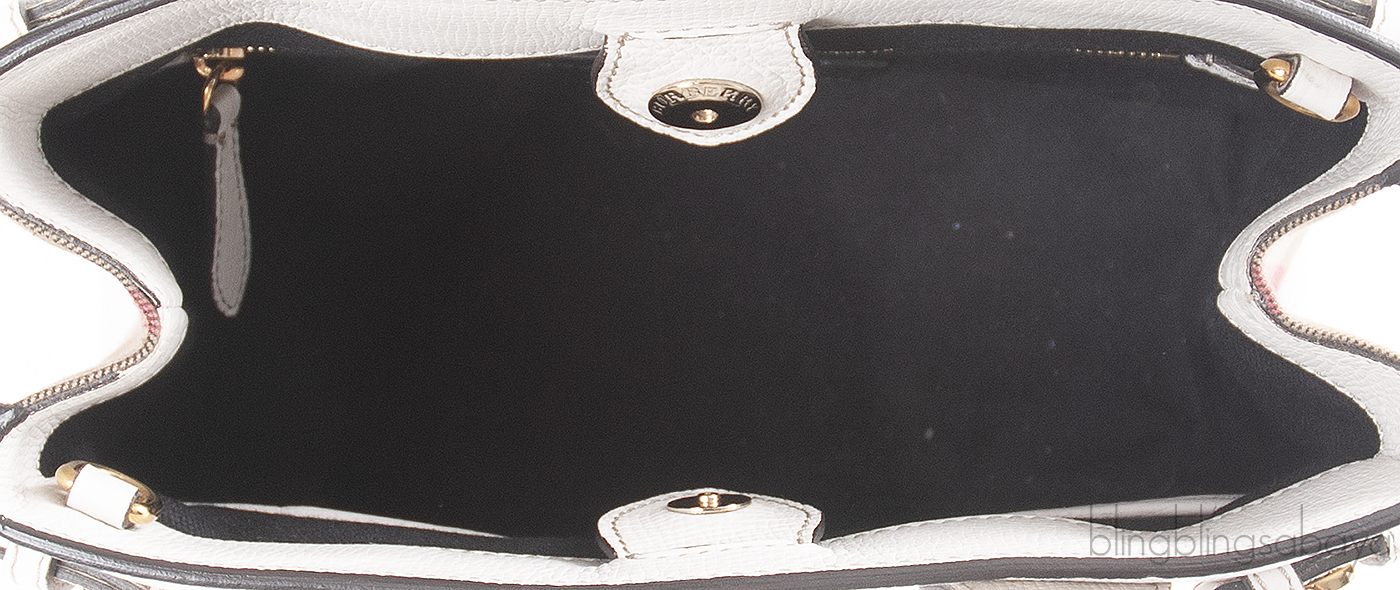 This Burberry White & Checkered Banner Top Handle Bag is crafted from white grained leather and house checked canvas accented with the gold hardware. This bag features a sturdy rolled leather handles and removable shoulder bag. Interior is fully lined with fabric and has two interior patch and one zip pocket inside.
