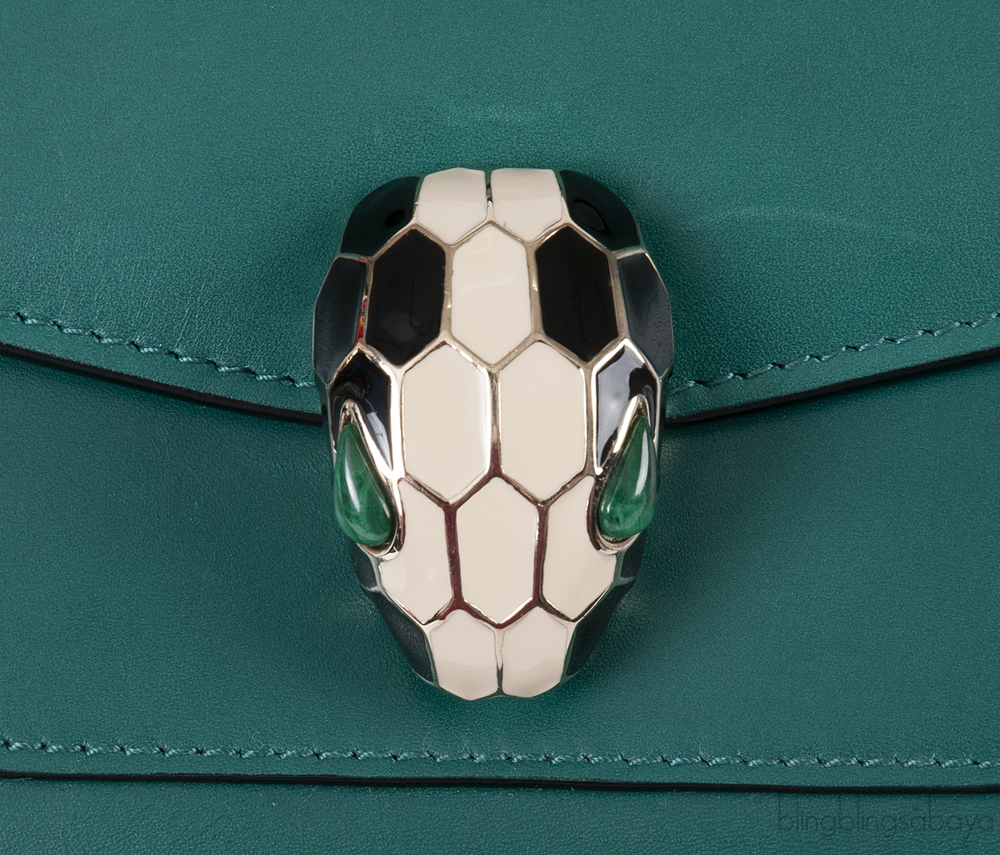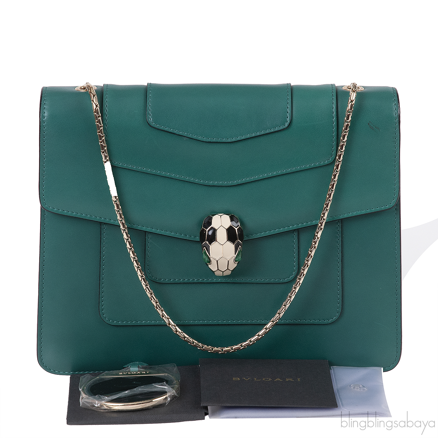 This enticing Serpenti Crossbody bag is beautifully crafted in dark green Calfskin Leather. This bag features the most famous light gold \"Serpent\" head closure in black & white enamel with seductive eyes in malachite that perfectly matches with a precious shoulder snake body shape chain.