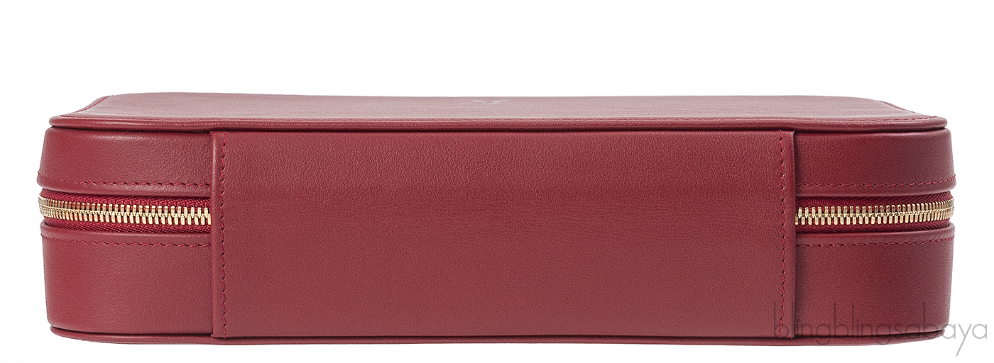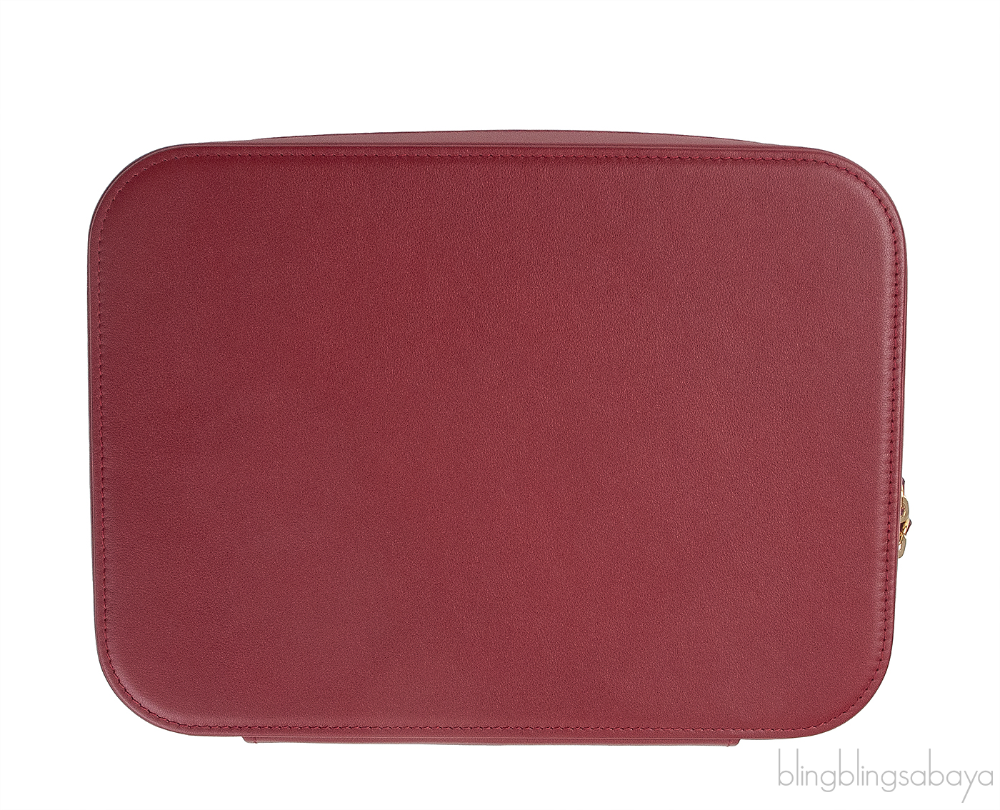 Cartier’s Diabolo de Cartier jewelry travel case offers a wallet-style design adorned with the signature Diabolo motif. Inside, it provides organized spaces for rings, bangles, bracelets, earrings, and pendants, along with two document slots on the lid and a detachable separator. Finished with a zip-around closure.