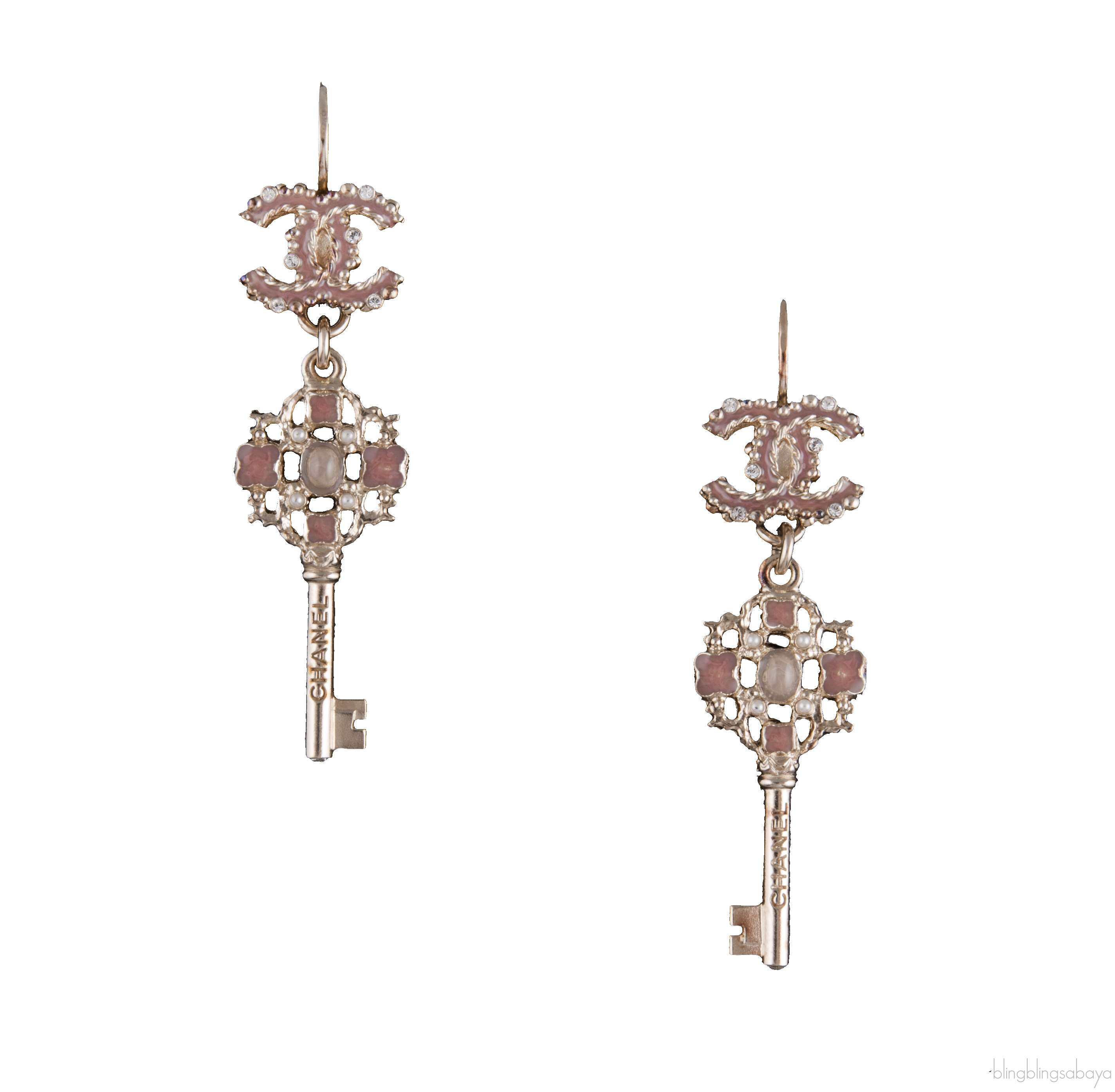These classic CC Key Piercing Earrings from Chane features light tone intertwined CC metal embellished with crystal stones and has dangling key motif accented with glass pearls and has brand name engraved in the shaft. Measuring 0.6" x 2.25"