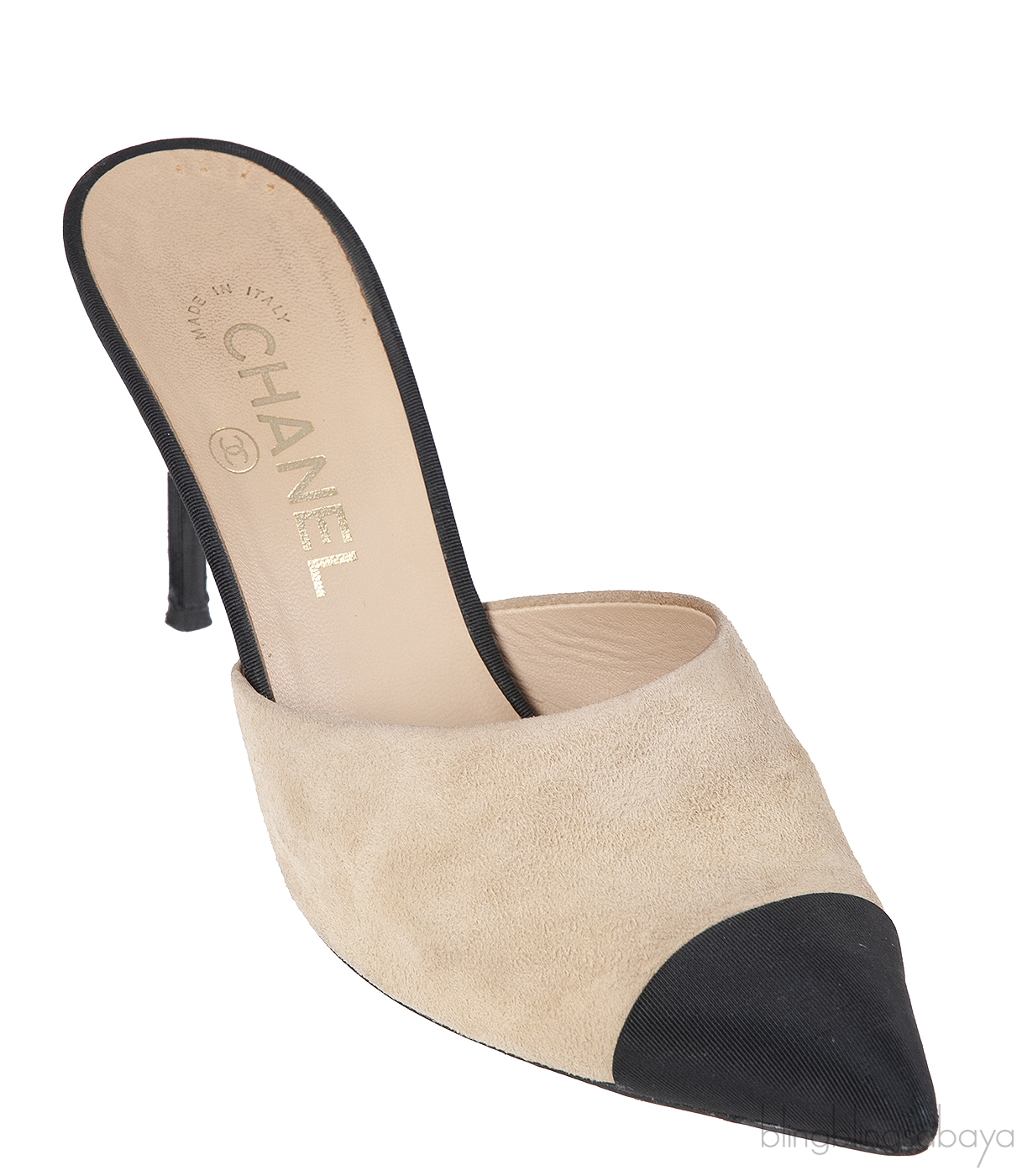 CHANEL BEIGE AND BLACK SUEDE POINTED MULE!