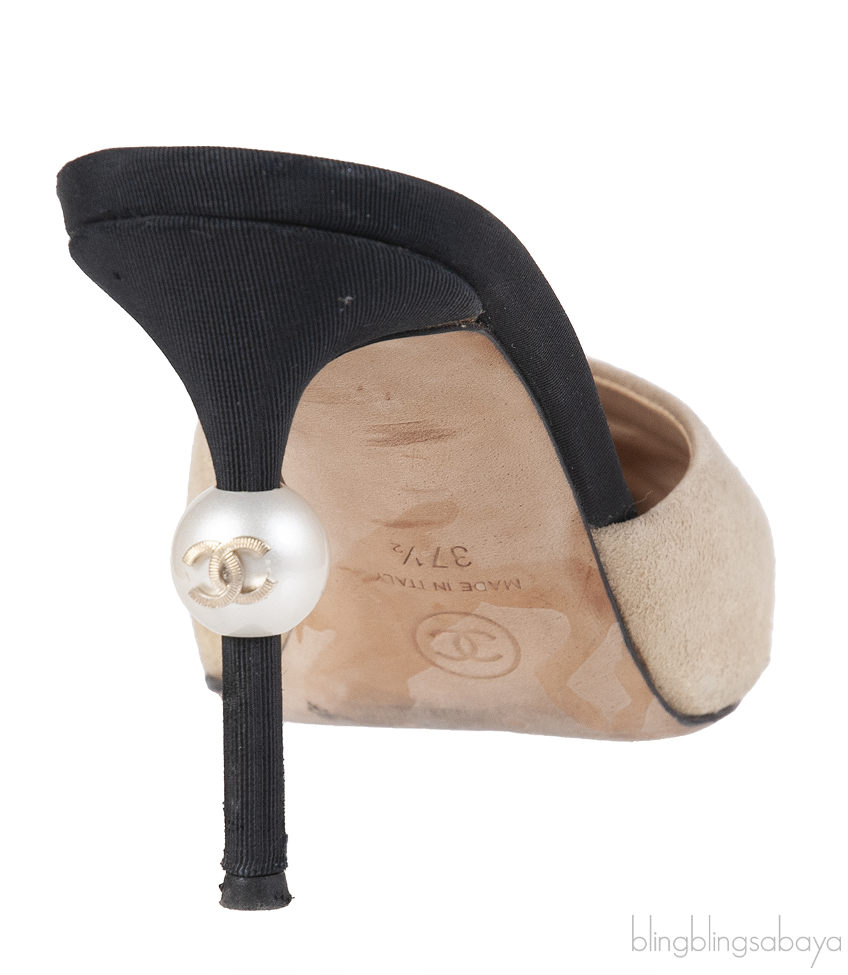 These Chanel Beige and Black Suede Pointed Mule are crafted from beige suede upper leather and black fabric with leather lining. These heels features a bi-color hue with pointed black cap toe, leather lined insole and sole, heels measuring 90 mm high with CC pearl.