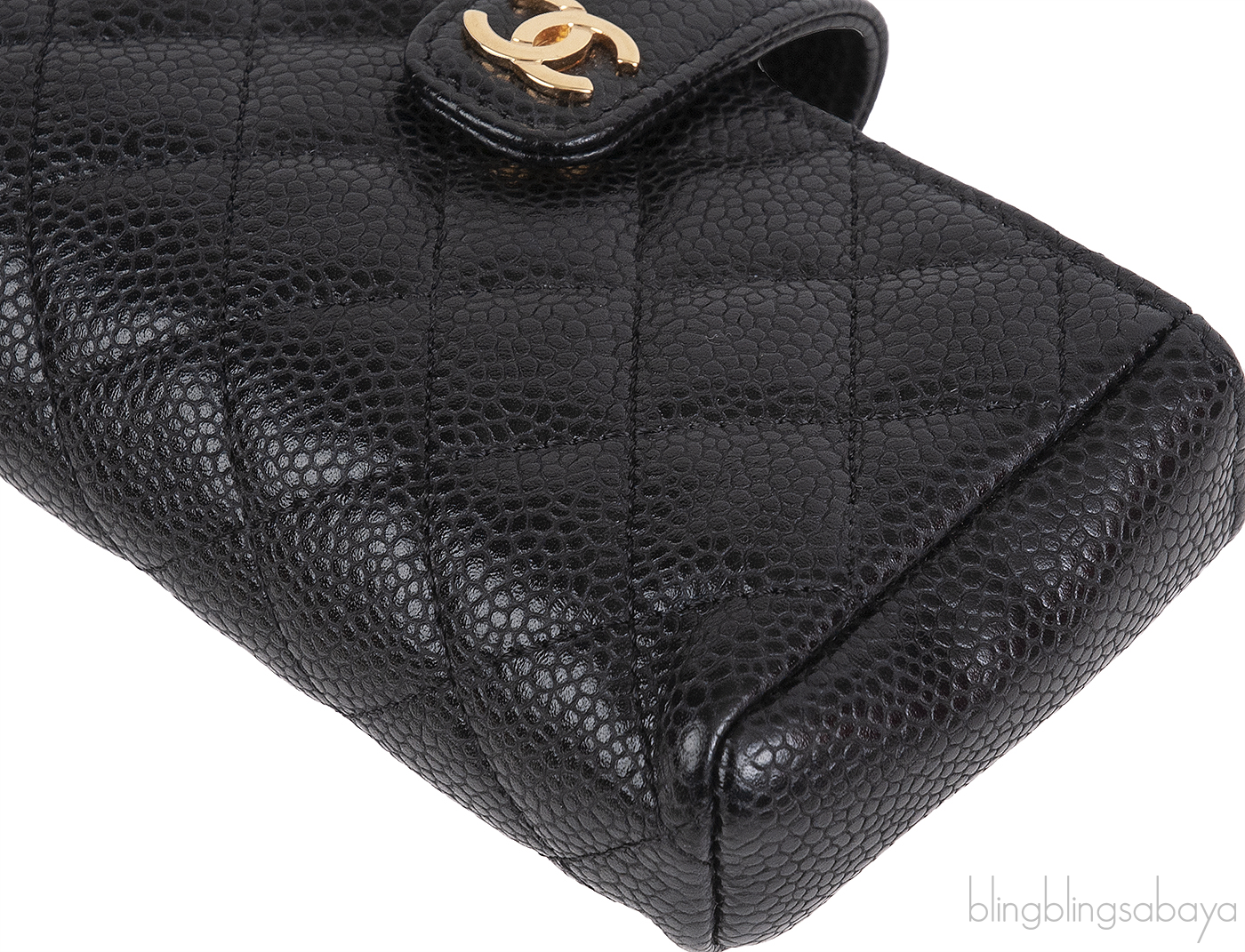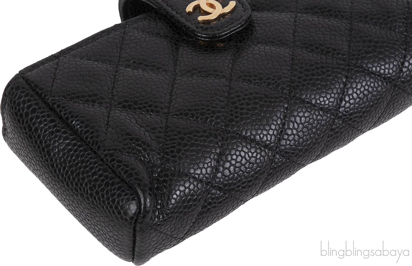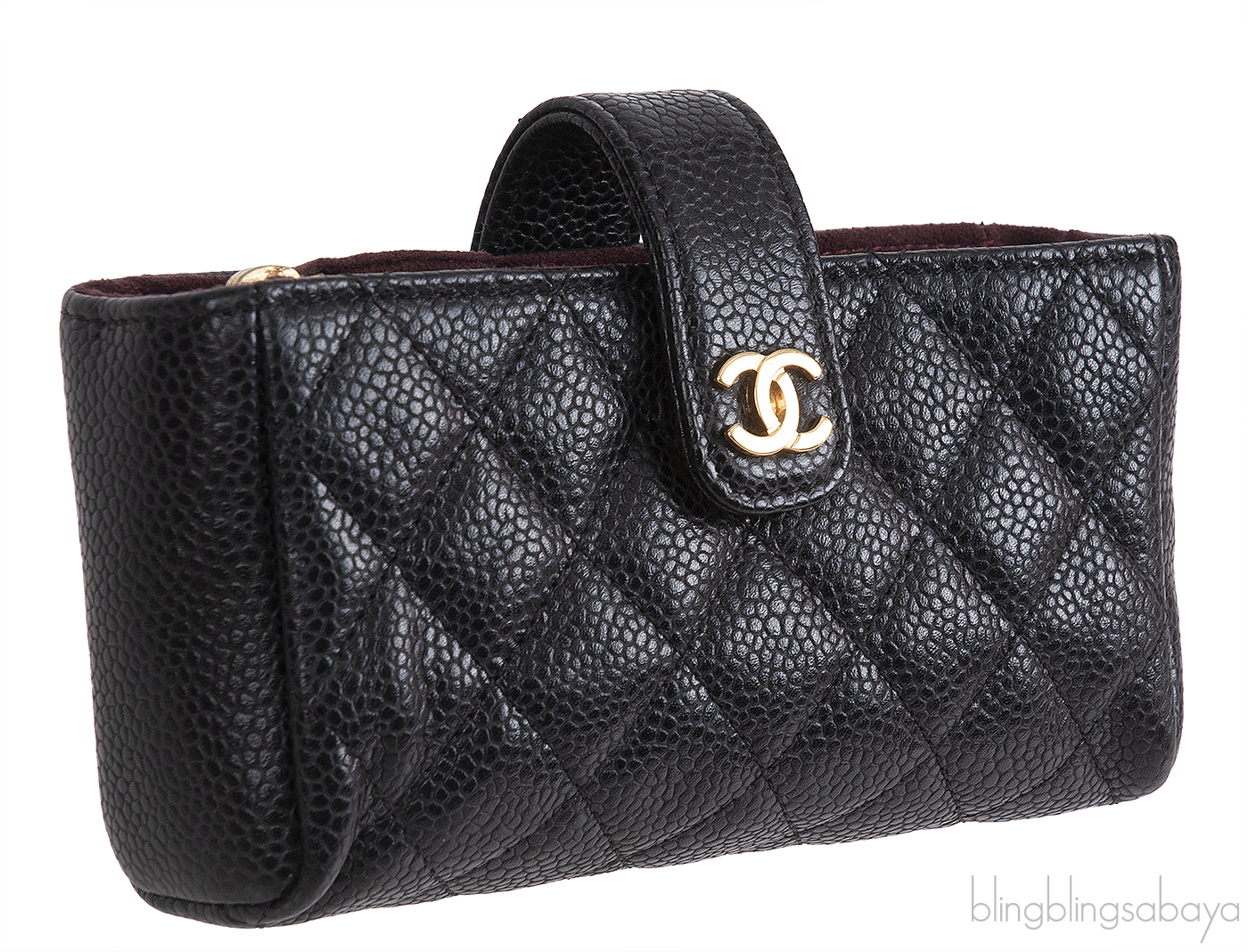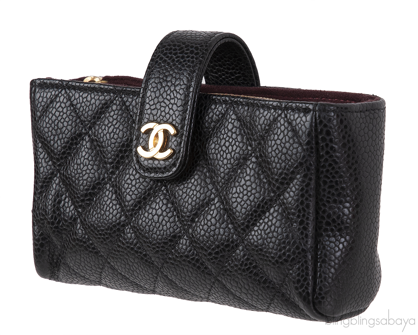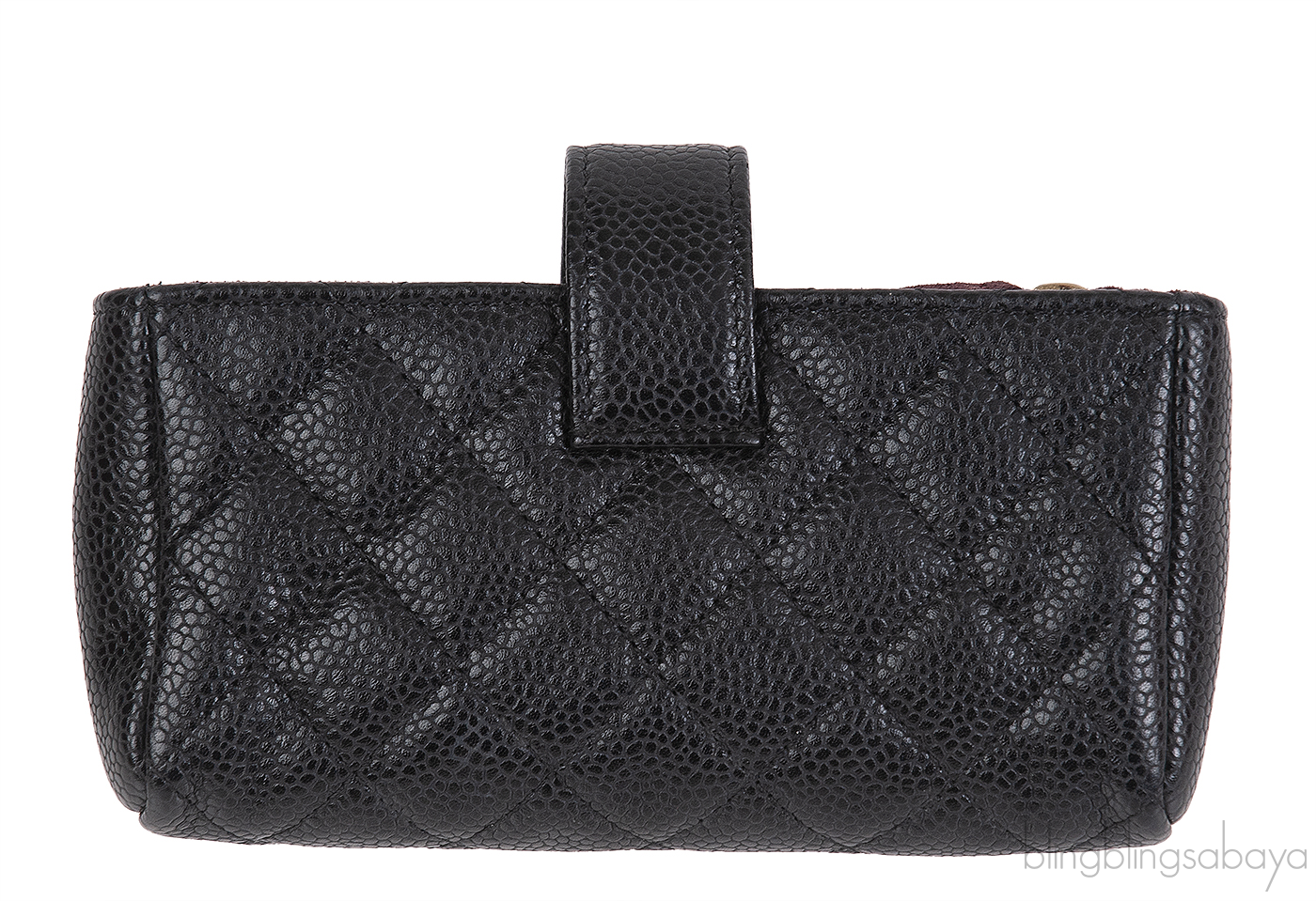 This Black Quilted Small Phone Holder from Chanel is crafted in elegant black quilted caviar leather accented with palladium hardware. This cute notable piece features a snap magnetic closure at front with small CC logo. Interior features two major compartments divided with a zip compartment at the mid-center.