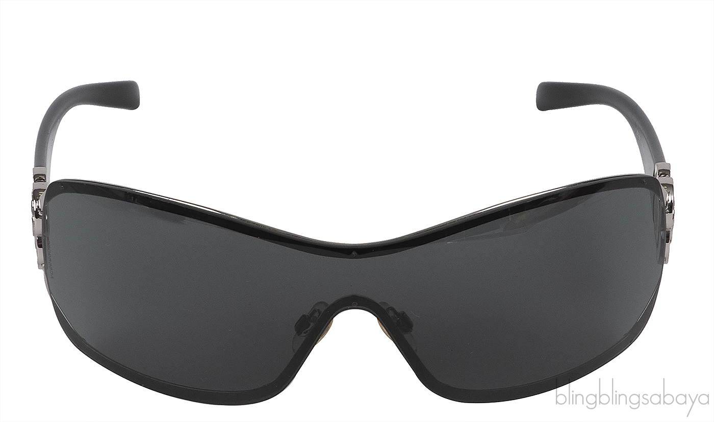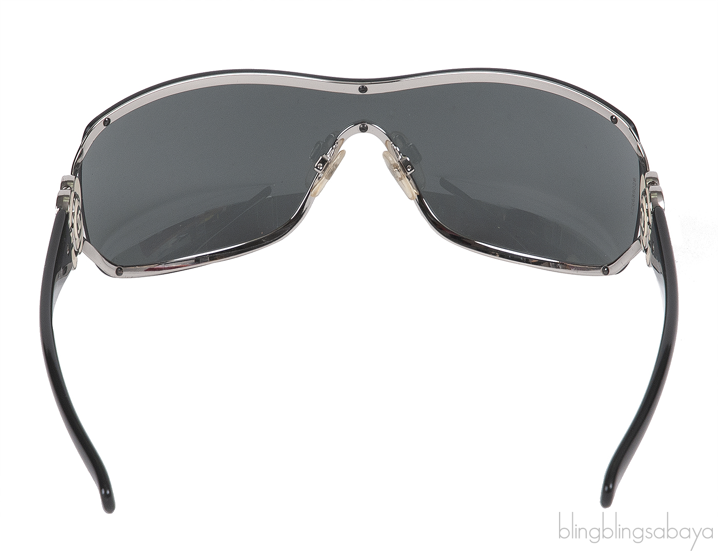 This Camellia CC 4164-B Black Sunglasses from Chanel is made silver metal frame with one piece black lens. The arms are black and feature a black and silver camellia and a Chanel CC logo.