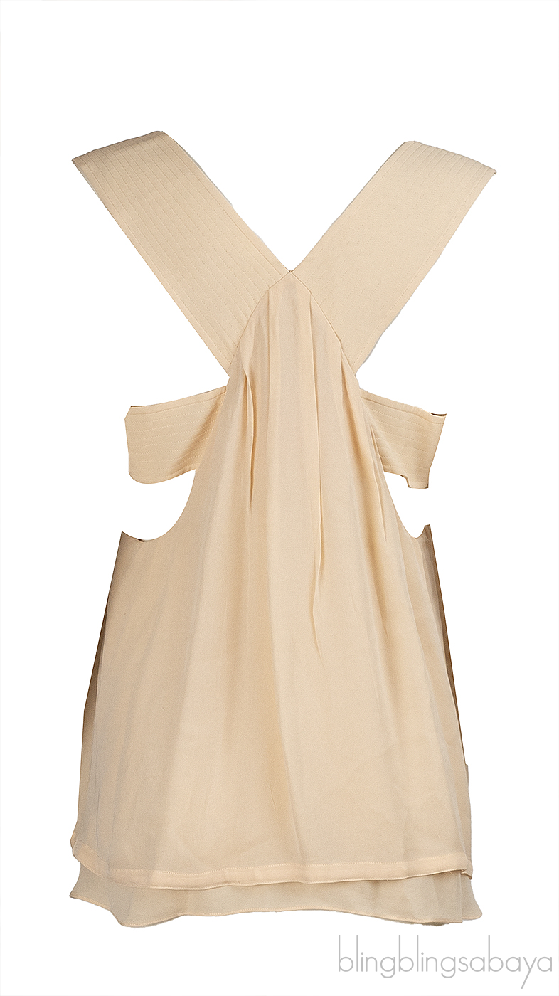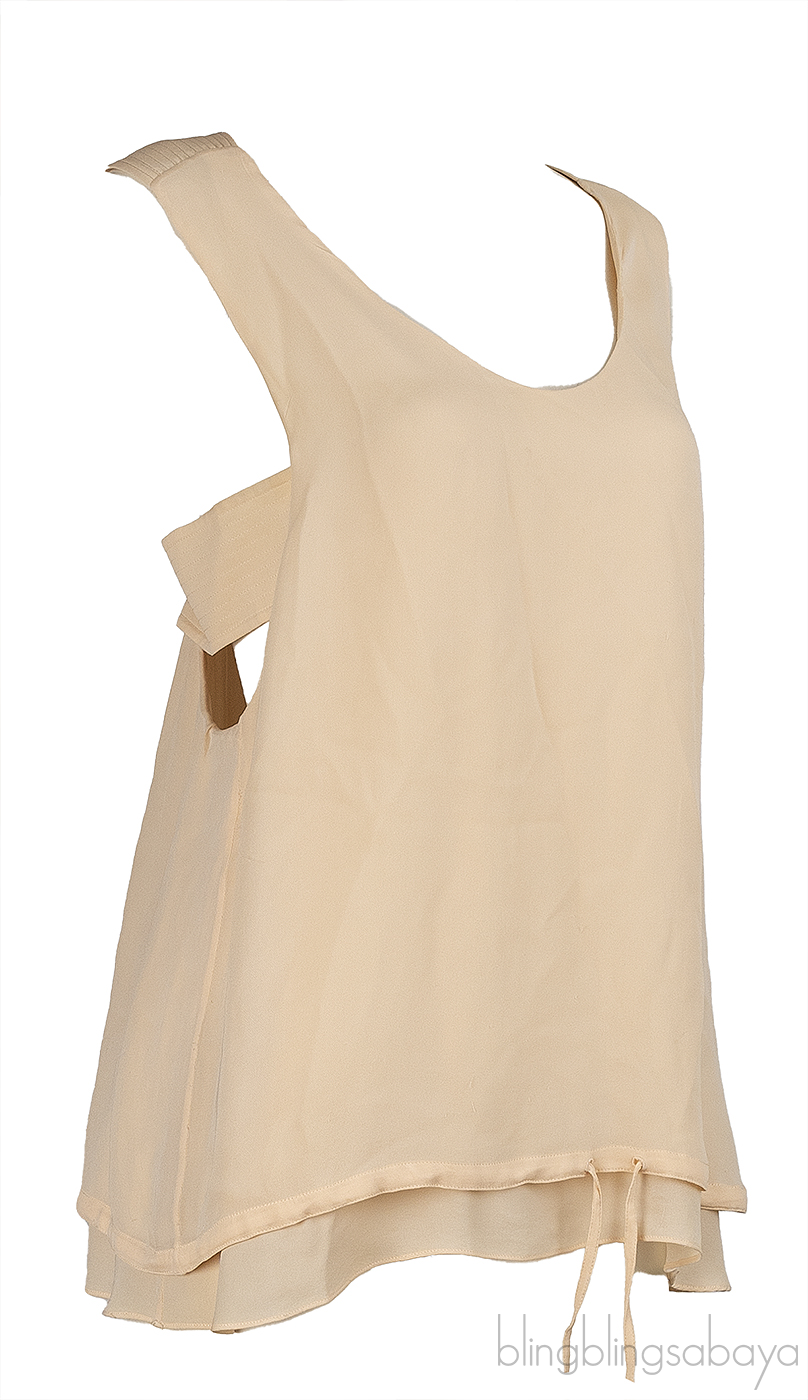 This Chloe Apricot Pink Sleeveless Top is crafted from 100% Silk in apricot pink featuring a scoop neckline, sleeveless, cut-out at back, double layered and drawstring at hem, pleated drapes at back with strap across the bust line.